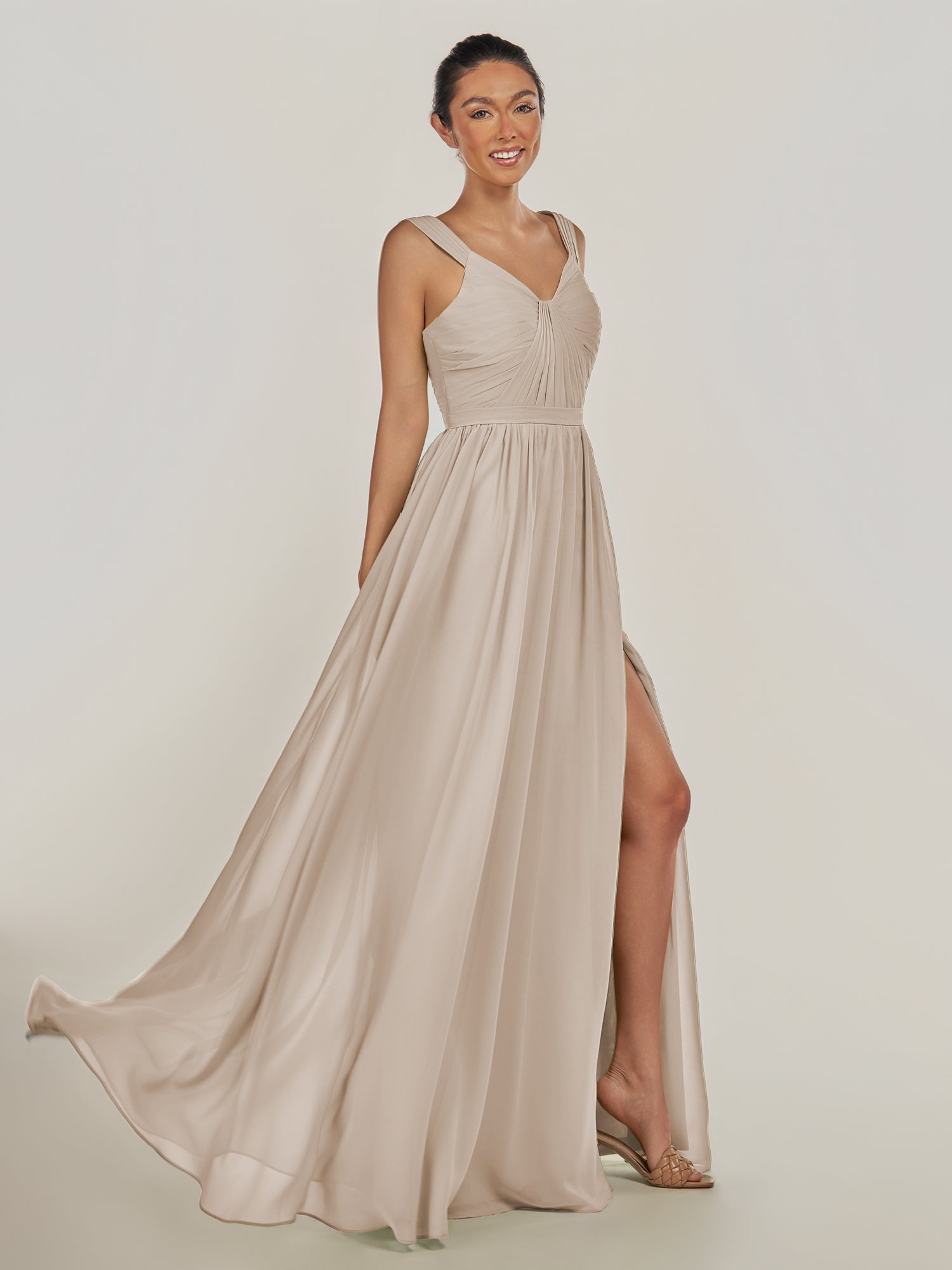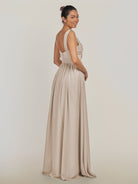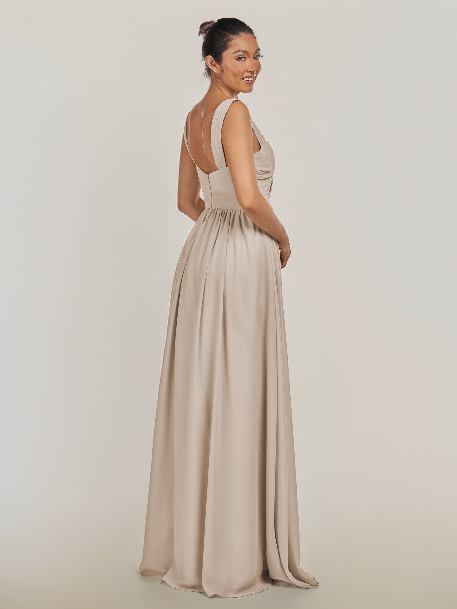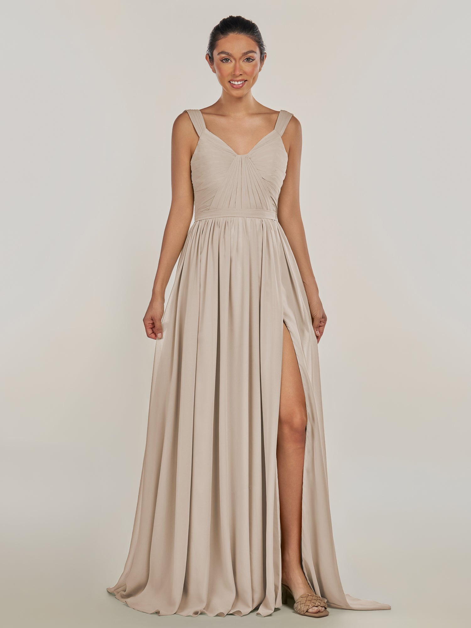 Fira is where soft romance meets timeless grace. Crafted from airy chiffon, she features a gentle V-neckline and delicate pleats that flatter every curve. Her A-line silhouette flows effortlessly to the floor, with a subtle slit that brings a modern, graceful touch. Finished with a smooth zipper back, Fira moves with poise and ease—perfect for bridesmaids who adore elegance with a fresh, refined charm.