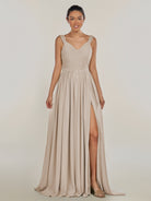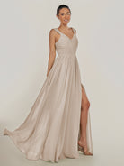 Fira | Frost - A Line Chiffon V Neck Pleated Long Bridesmaid Dress with Slit