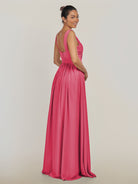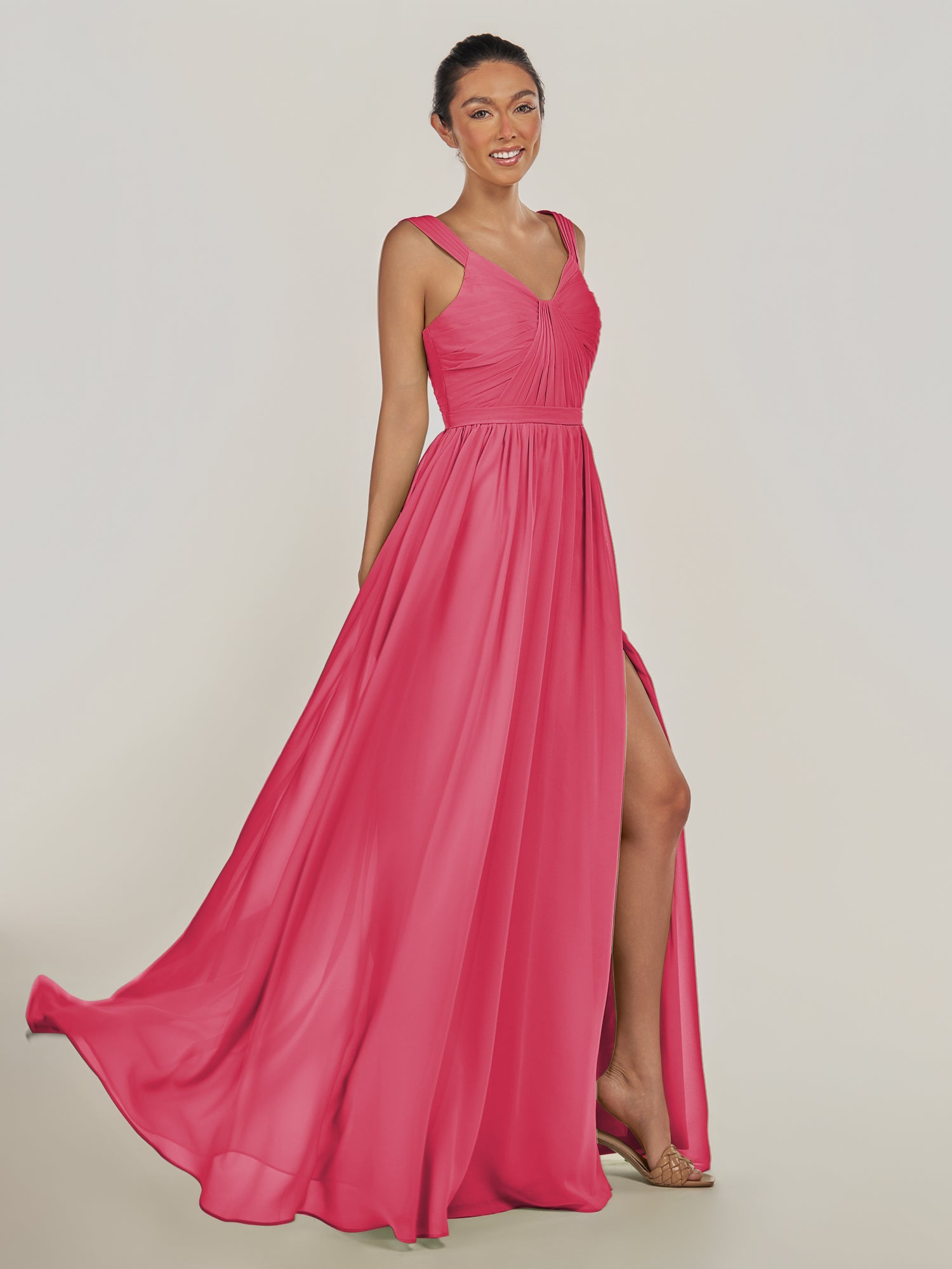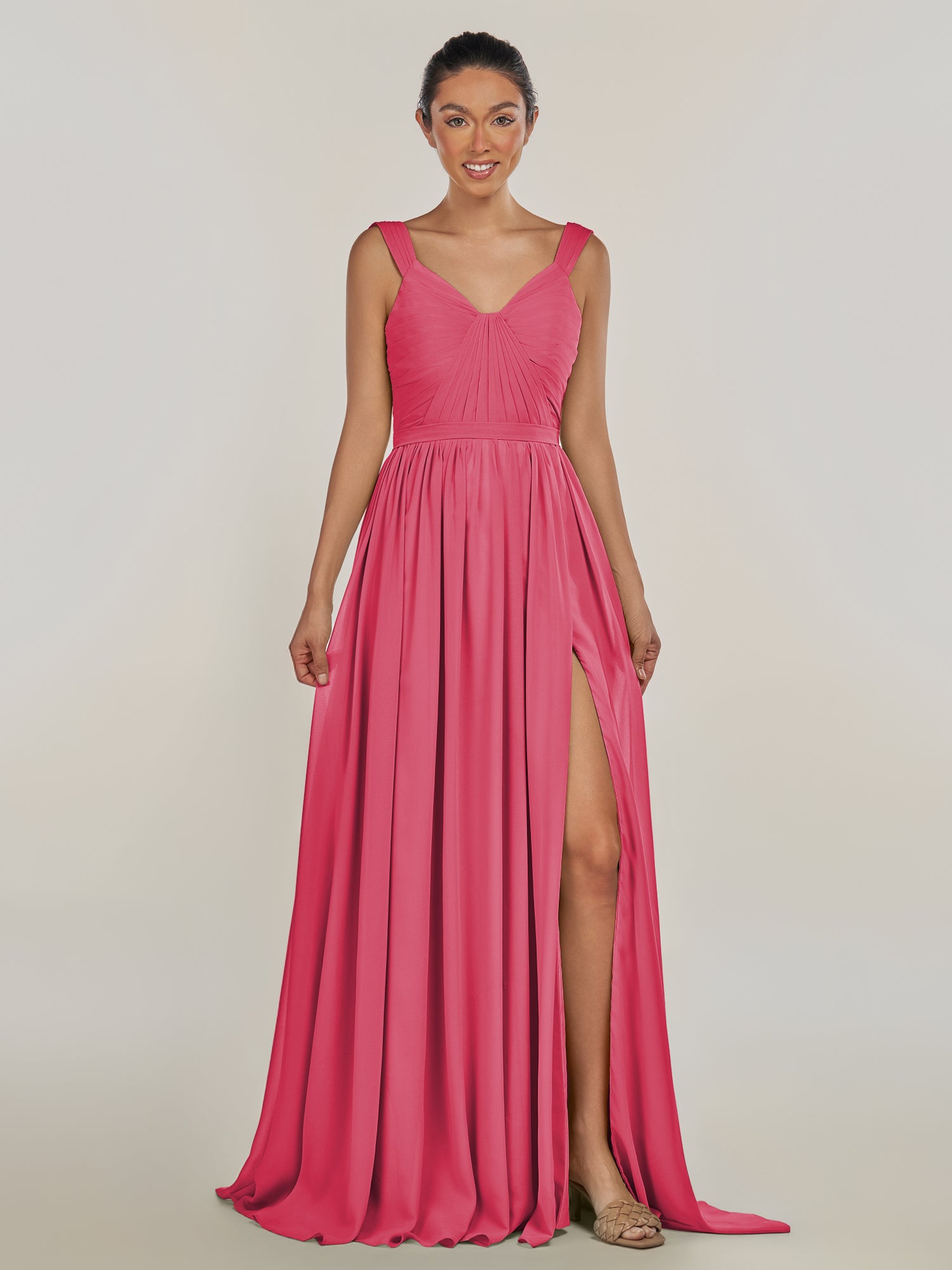 Fira | Fuchsia - A Line Chiffon V Neck Pleated Long Bridesmaid Dress with Slit
