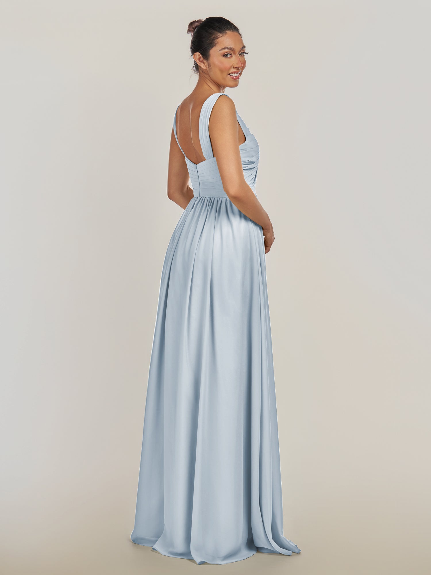 Fira is where soft romance meets timeless grace. Crafted from airy chiffon, she features a gentle V-neckline and delicate pleats that flatter every curve. Her A-line silhouette flows effortlessly to the floor, with a subtle slit that brings a modern, graceful touch. Finished with a smooth zipper back, Fira moves with poise and ease—perfect for bridesmaids who adore elegance with a fresh, refined charm.