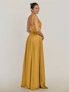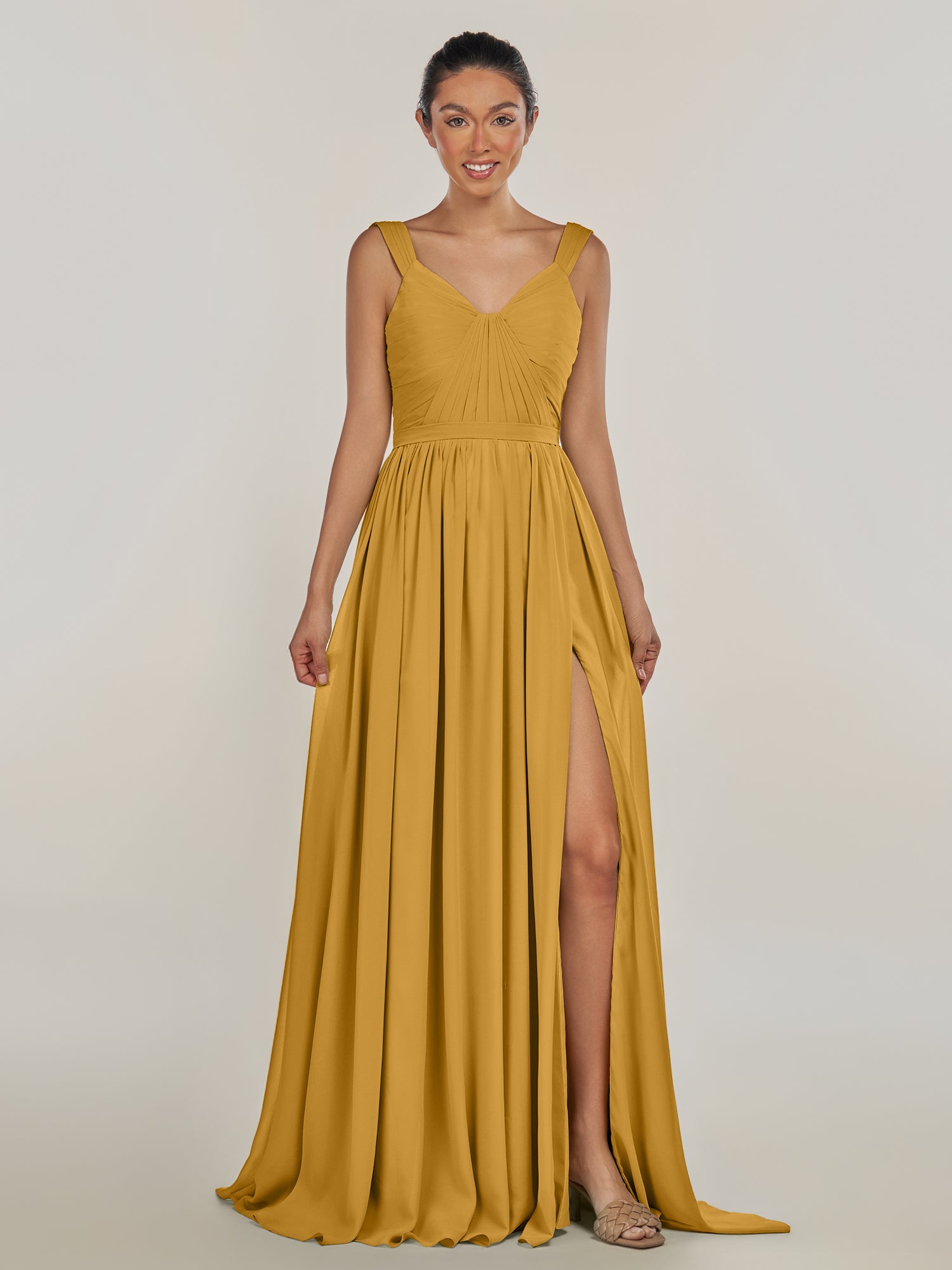 Fira | Marigold - A Line Chiffon V Neck Pleated Long Bridesmaid Dress with Slit