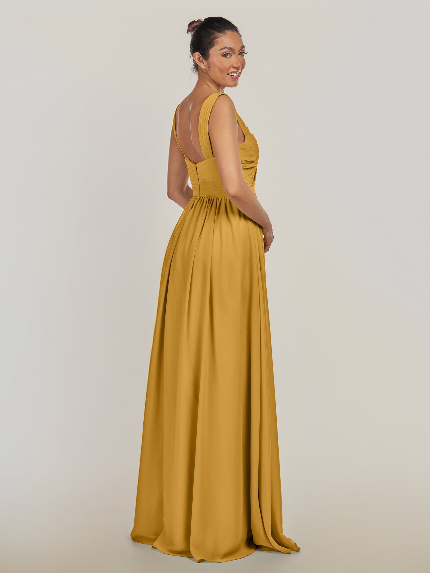 Fira is where soft romance meets timeless grace. Crafted from airy chiffon, she features a gentle V-neckline and delicate pleats that flatter every curve. Her A-line silhouette flows effortlessly to the floor, with a subtle slit that brings a modern, graceful touch. Finished with a smooth zipper back, Fira moves with poise and ease—perfect for bridesmaids who adore elegance with a fresh, refined charm.