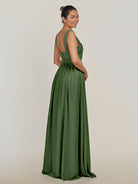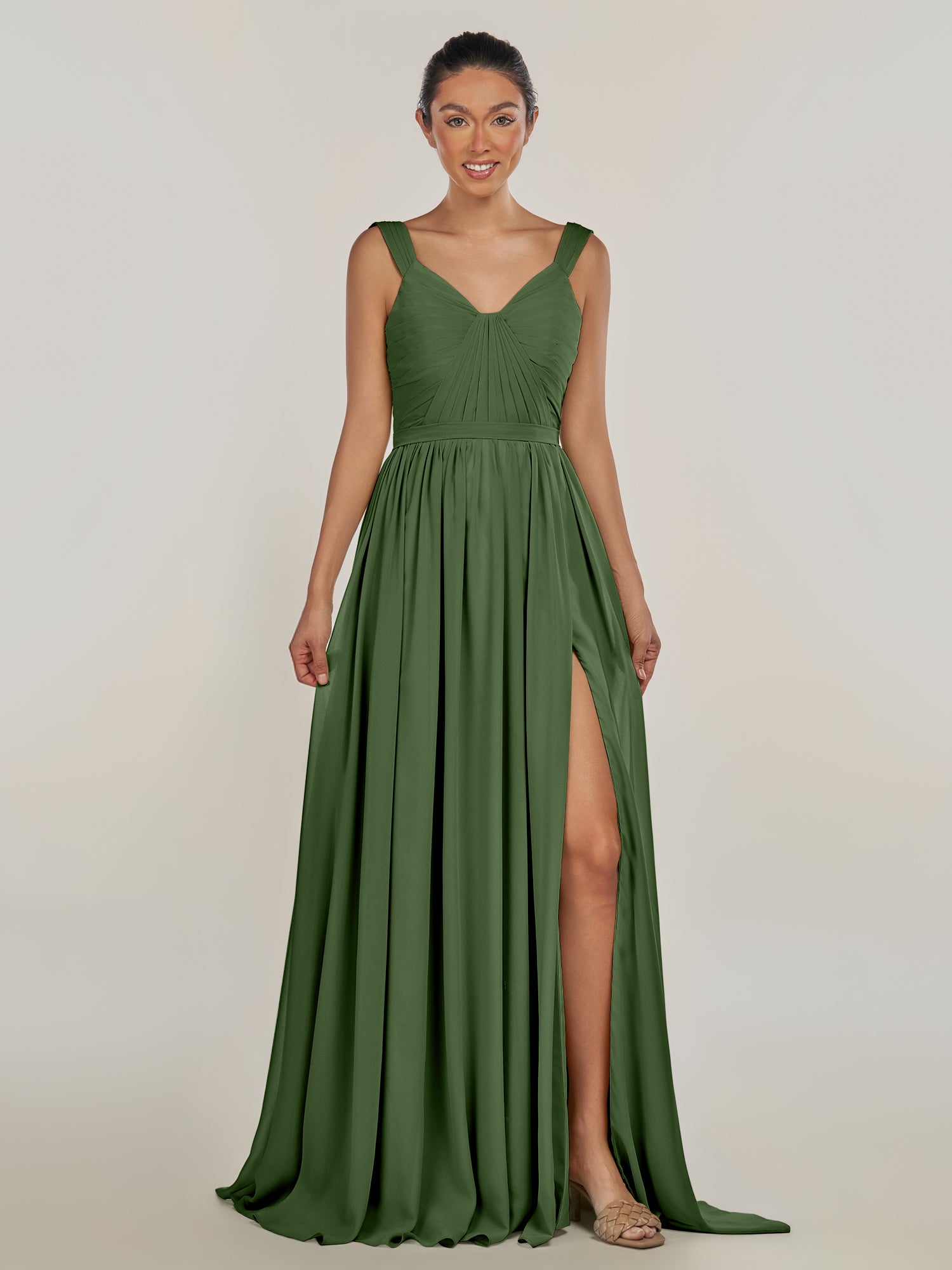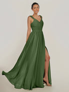 Fira | Moss - A Line Chiffon V Neck Pleated Long Bridesmaid Dress with Slit