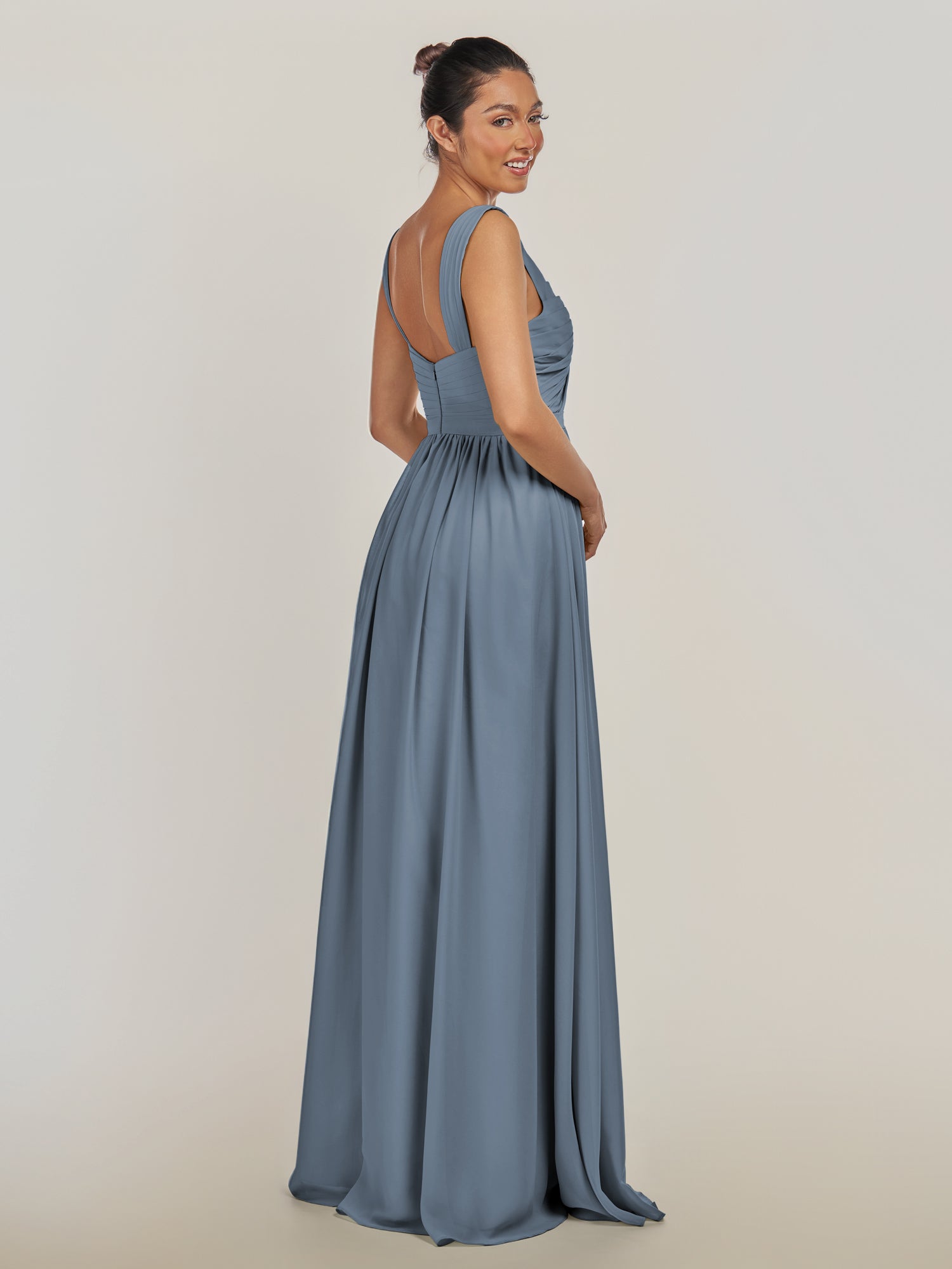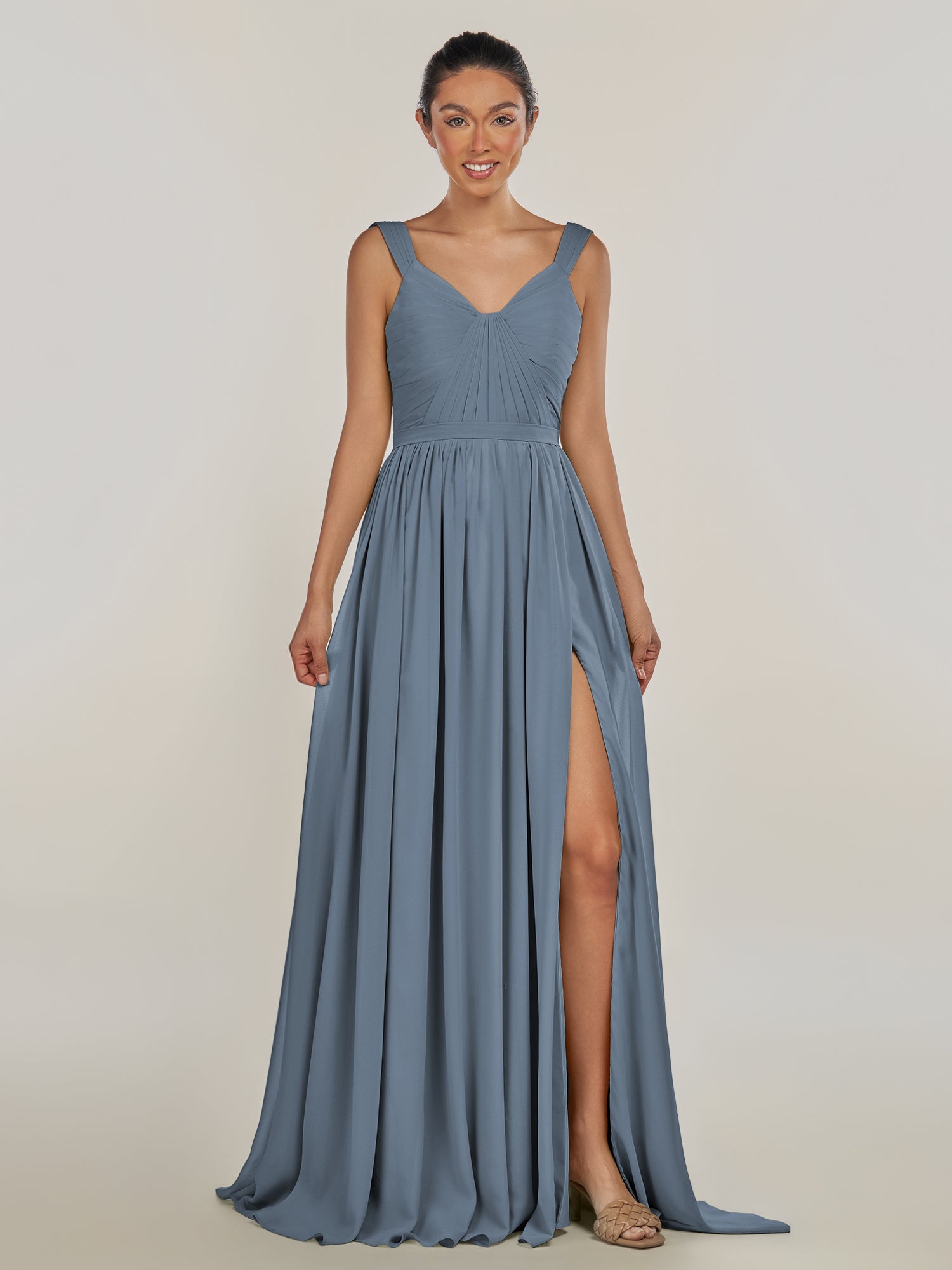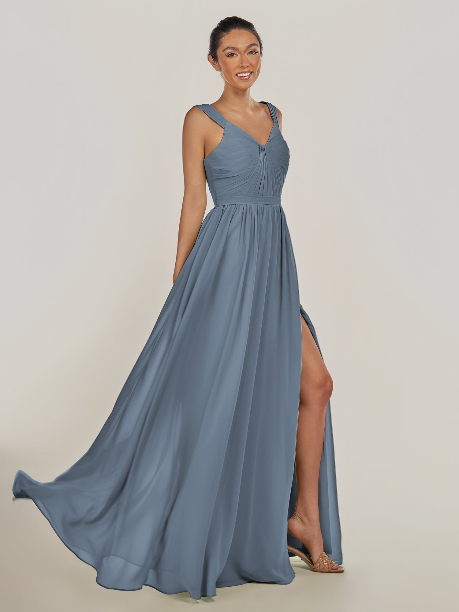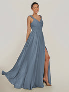 Fira | Neptune - A Line Chiffon V Neck Pleated Long Bridesmaid Dress with Slit