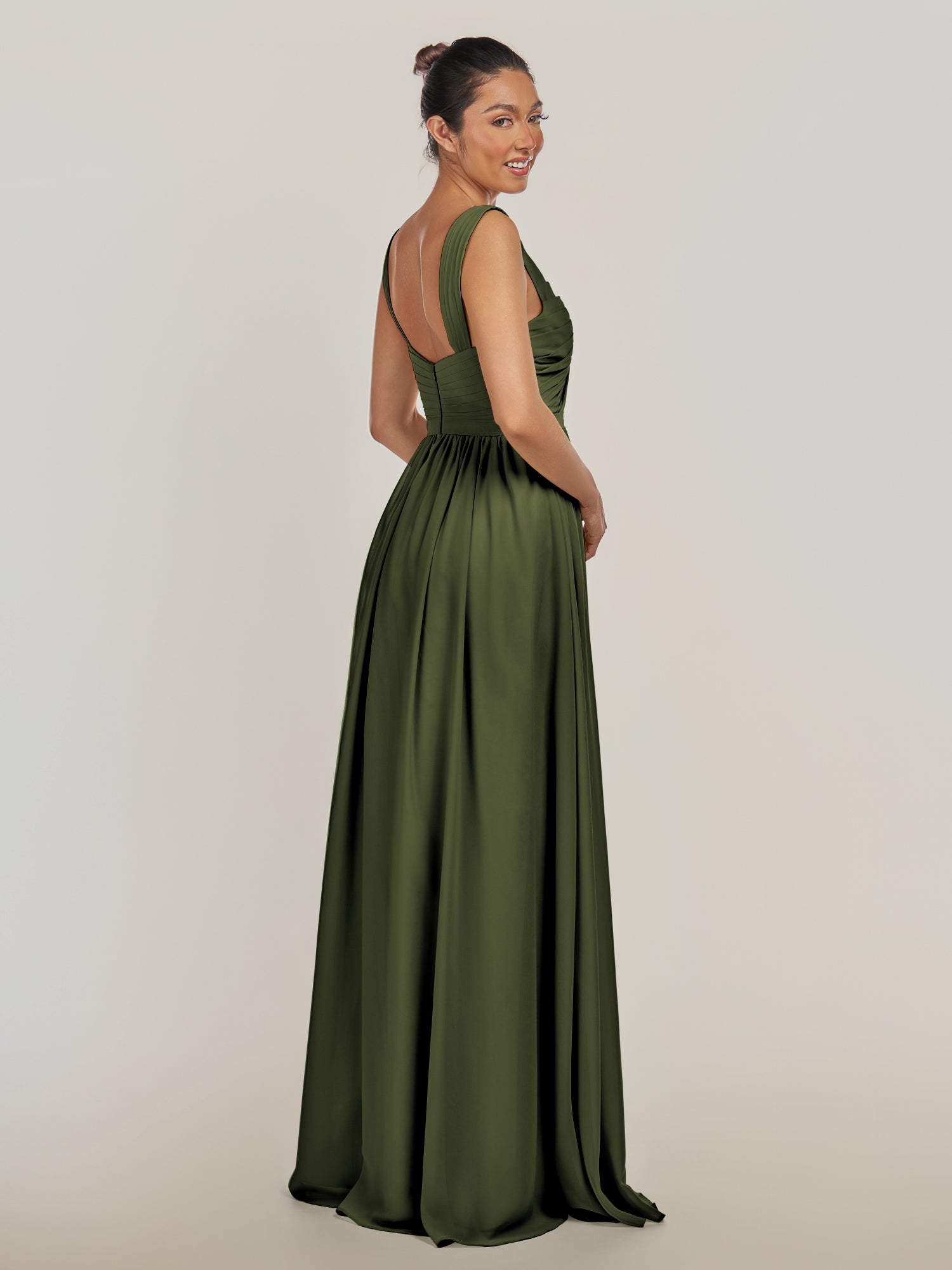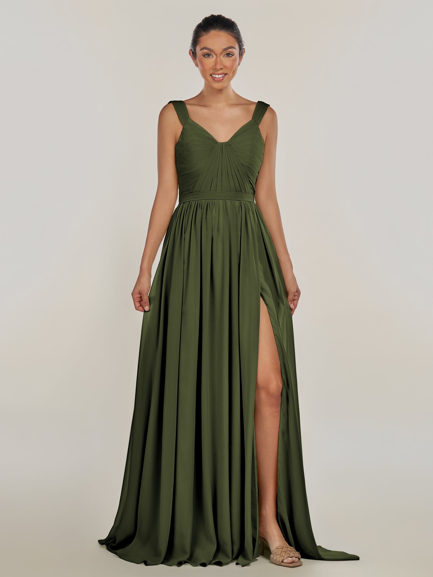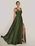 Fira | Olive - A Line Chiffon V Neck Pleated Long Bridesmaid Dress with Slit