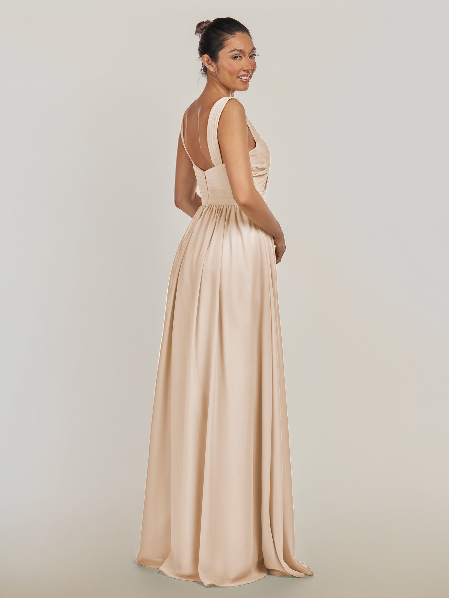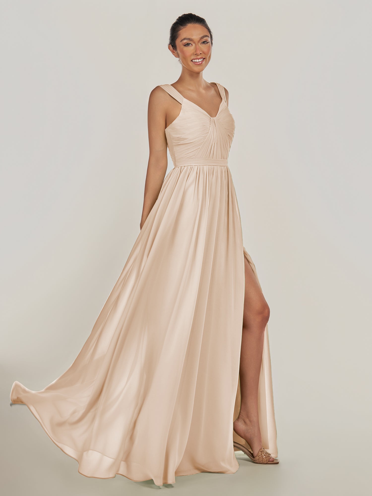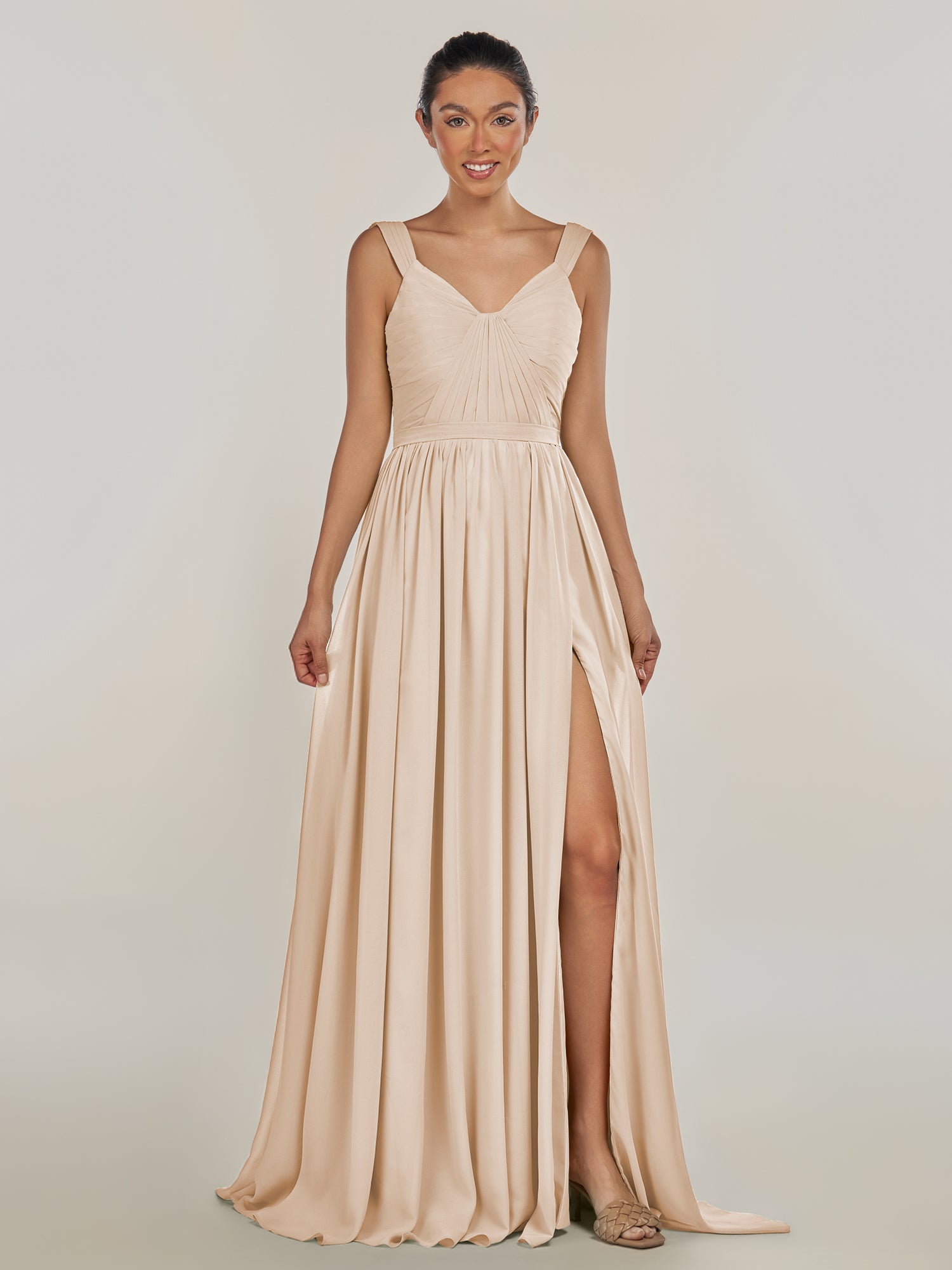 Fira is where soft romance meets timeless grace. Crafted from airy chiffon, she features a gentle V-neckline and delicate pleats that flatter every curve. Her A-line silhouette flows effortlessly to the floor, with a subtle slit that brings a modern, graceful touch. Finished with a smooth zipper back, Fira moves with poise and ease—perfect for bridesmaids who adore elegance with a fresh, refined charm.