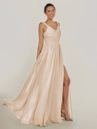 Fira | Pale Blush - A Line Chiffon V Neck Pleated Long Bridesmaid Dress with Slit
