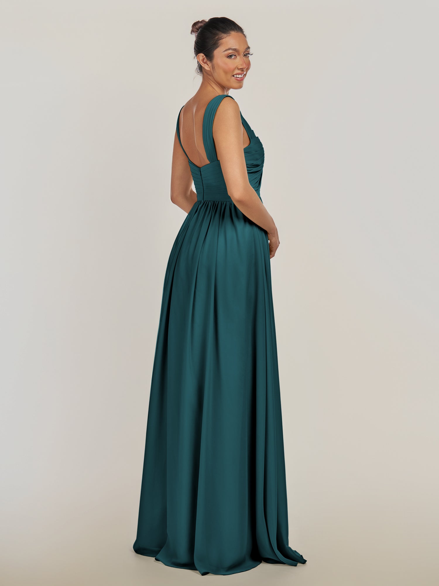 Fira | Pine - A Line Chiffon V Neck Pleated Long Bridesmaid Dress with Slit
