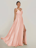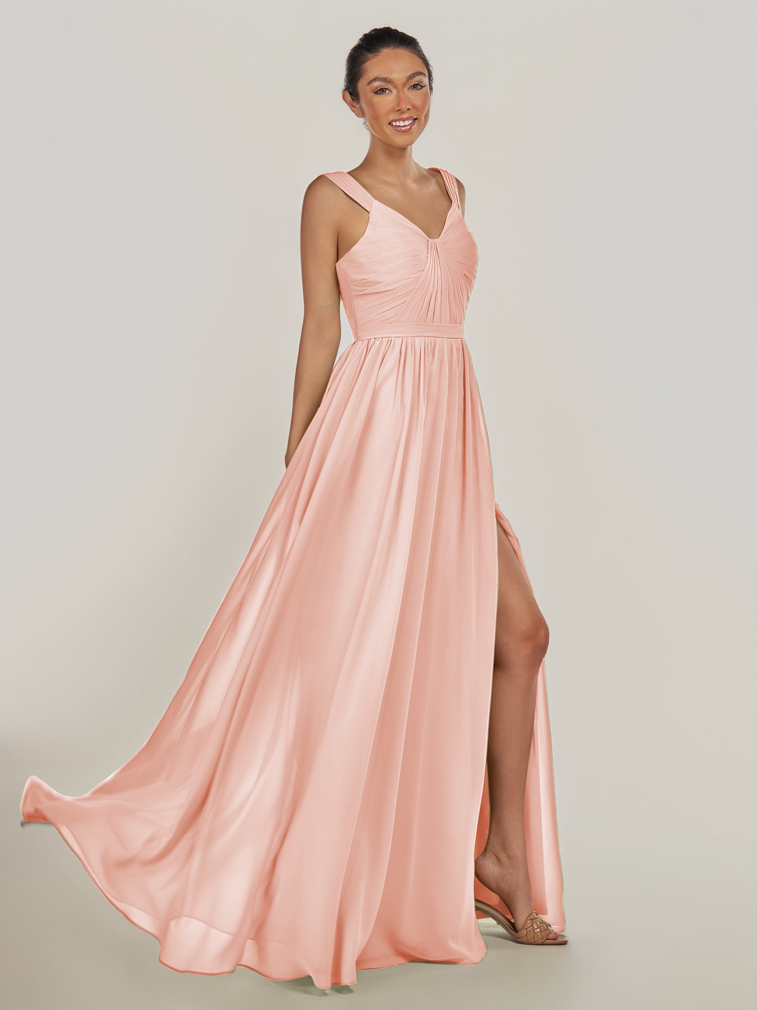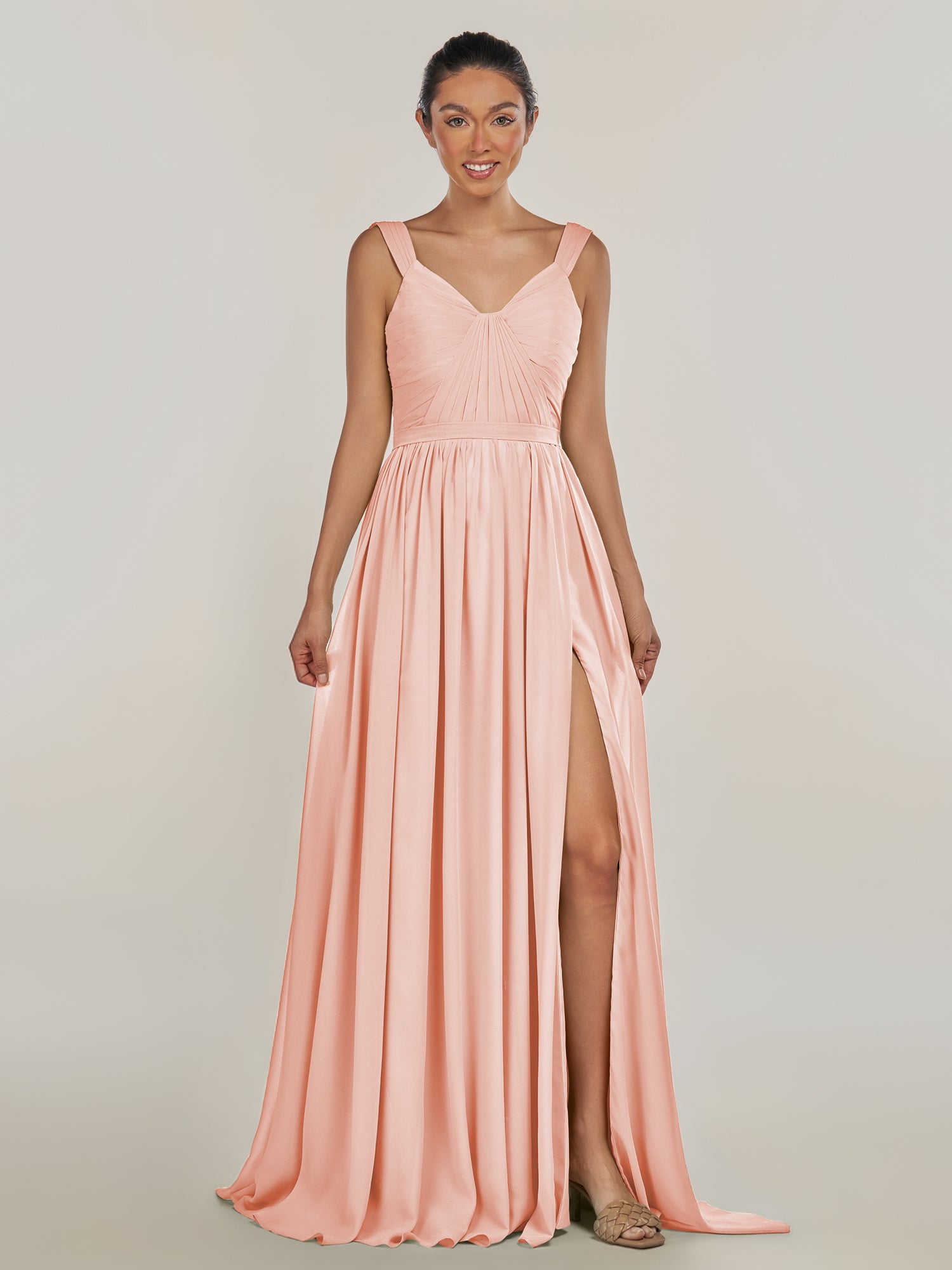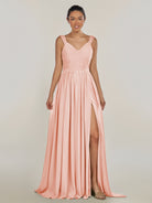 Fira | Rose Petal - A Line Chiffon V Neck Pleated Long Bridesmaid Dress with Slit