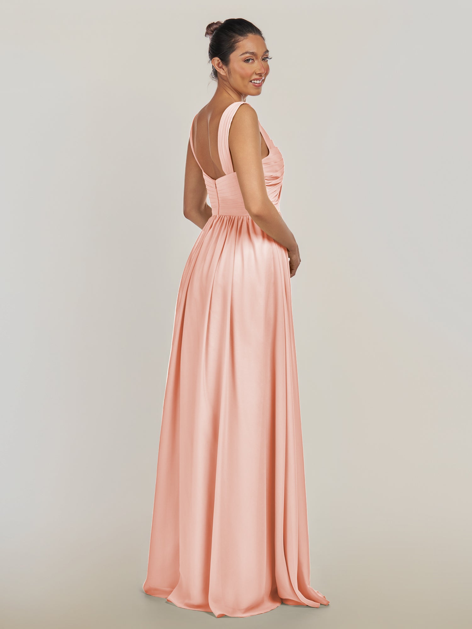 Fira is where soft romance meets timeless grace. Crafted from airy chiffon, she features a gentle V-neckline and delicate pleats that flatter every curve. Her A-line silhouette flows effortlessly to the floor, with a subtle slit that brings a modern, graceful touch. Finished with a smooth zipper back, Fira moves with poise and ease—perfect for bridesmaids who adore elegance with a fresh, refined charm.
