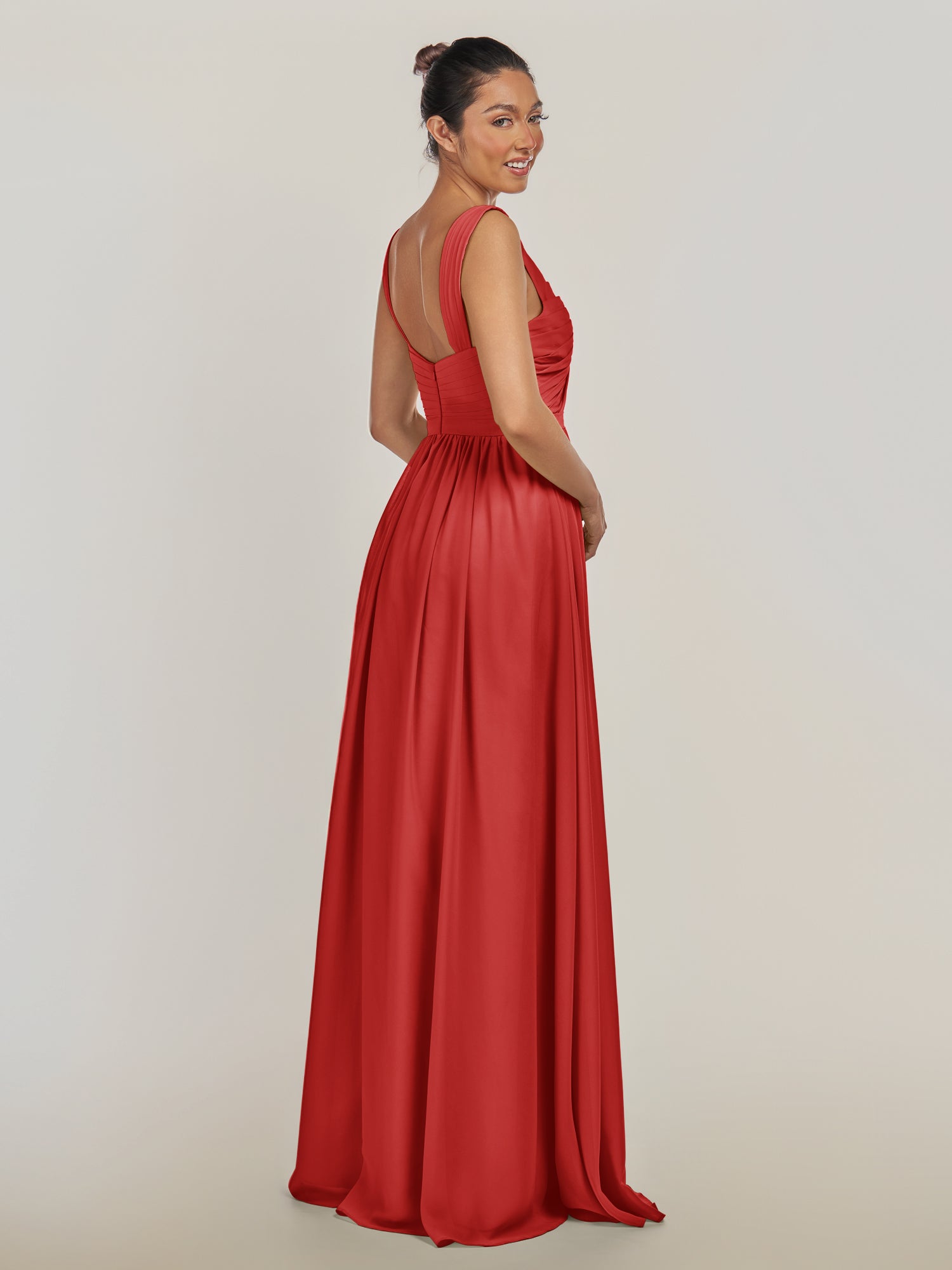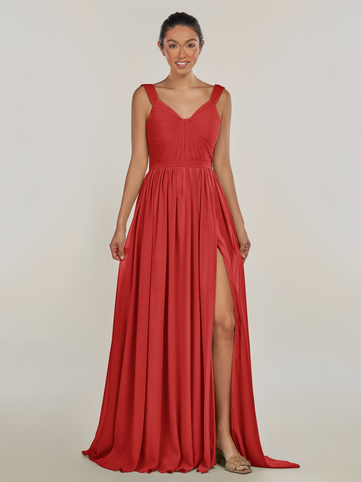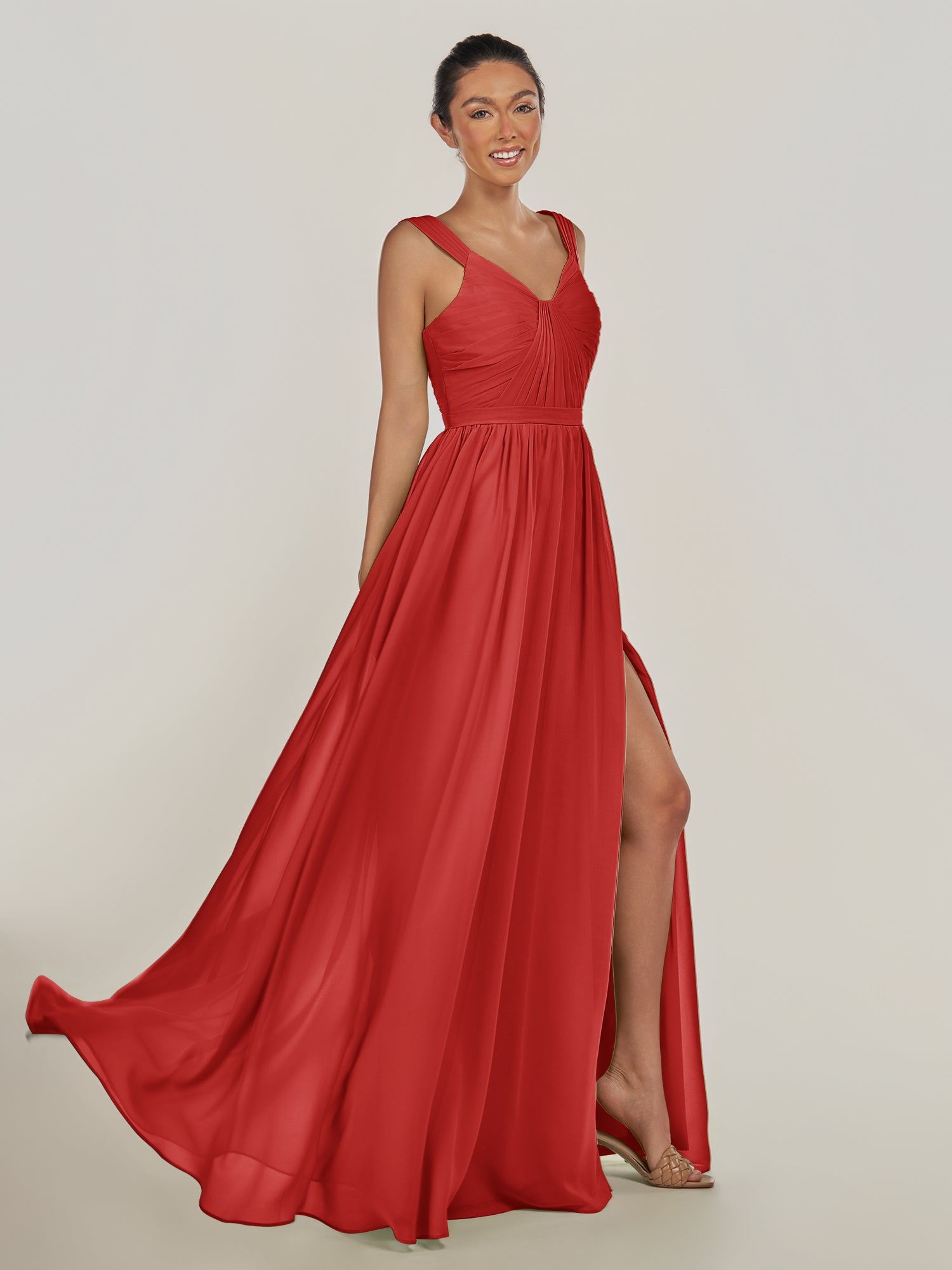 Fira | Ruby Red - A Line Chiffon V Neck Pleated Long Bridesmaid Dress with Slit