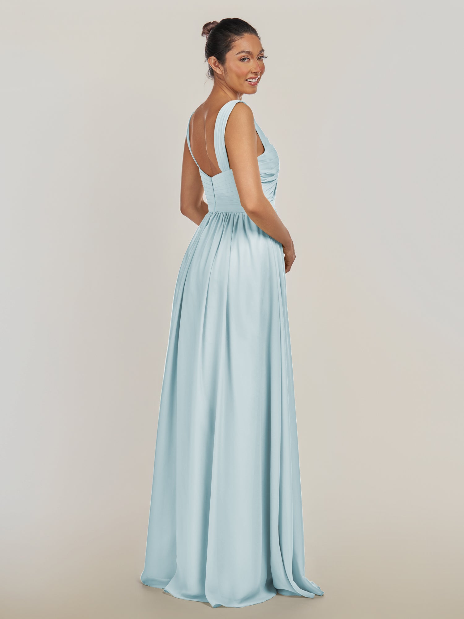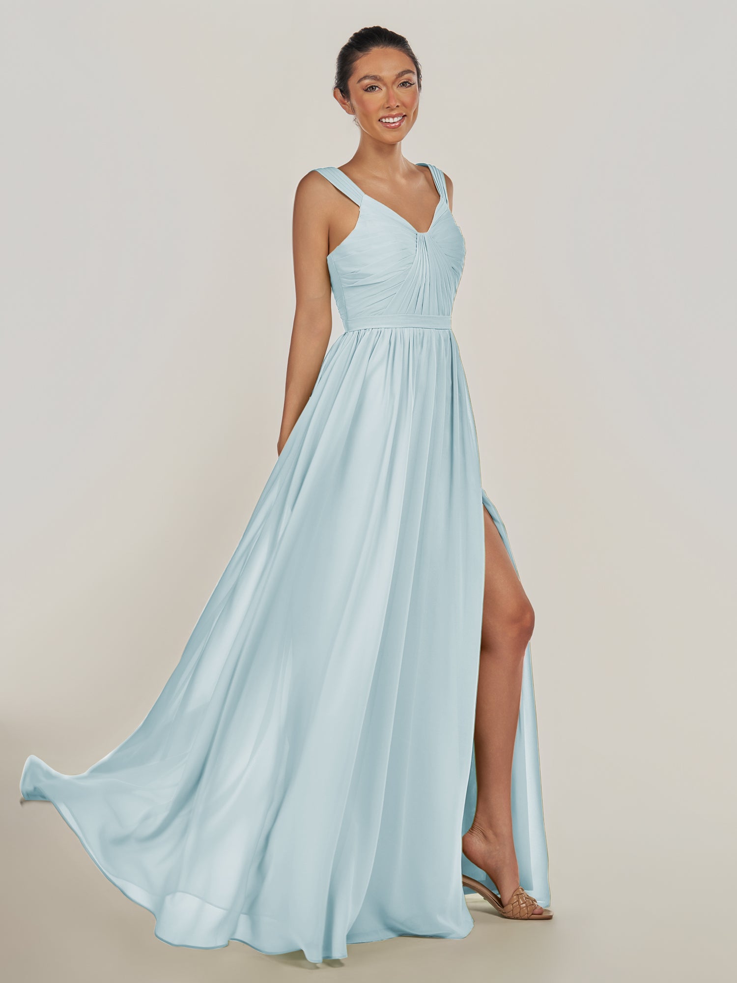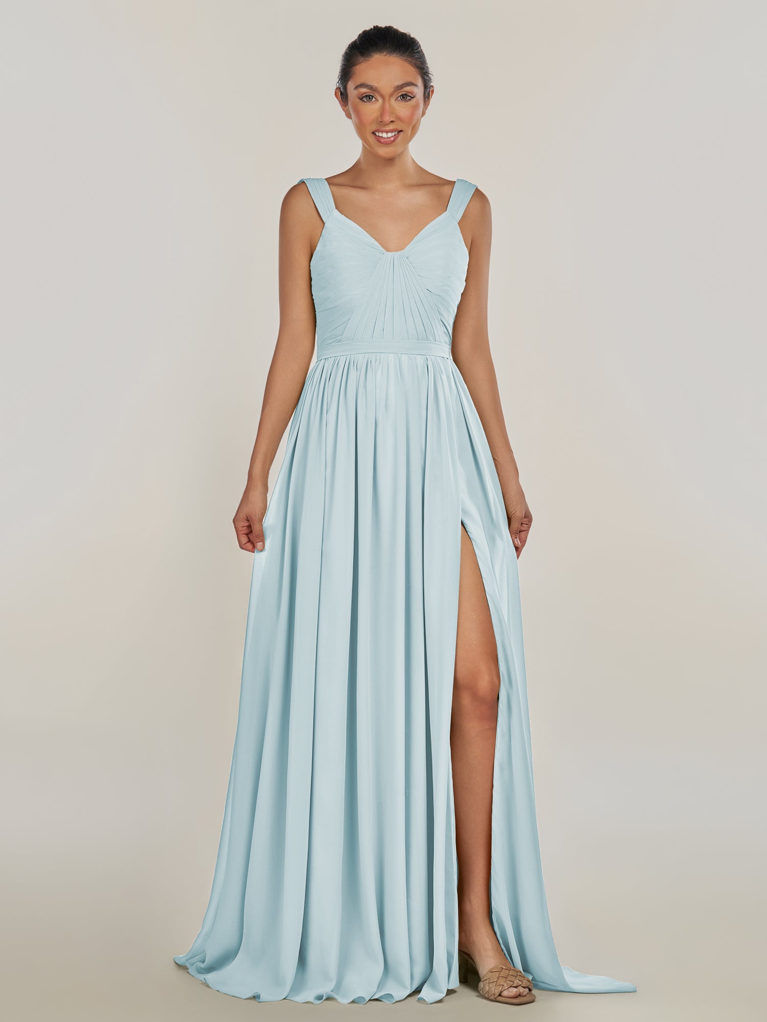 Fira | Sky Blue - A Line Chiffon V Neck Pleated Long Bridesmaid Dress with Slit