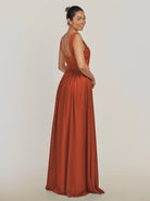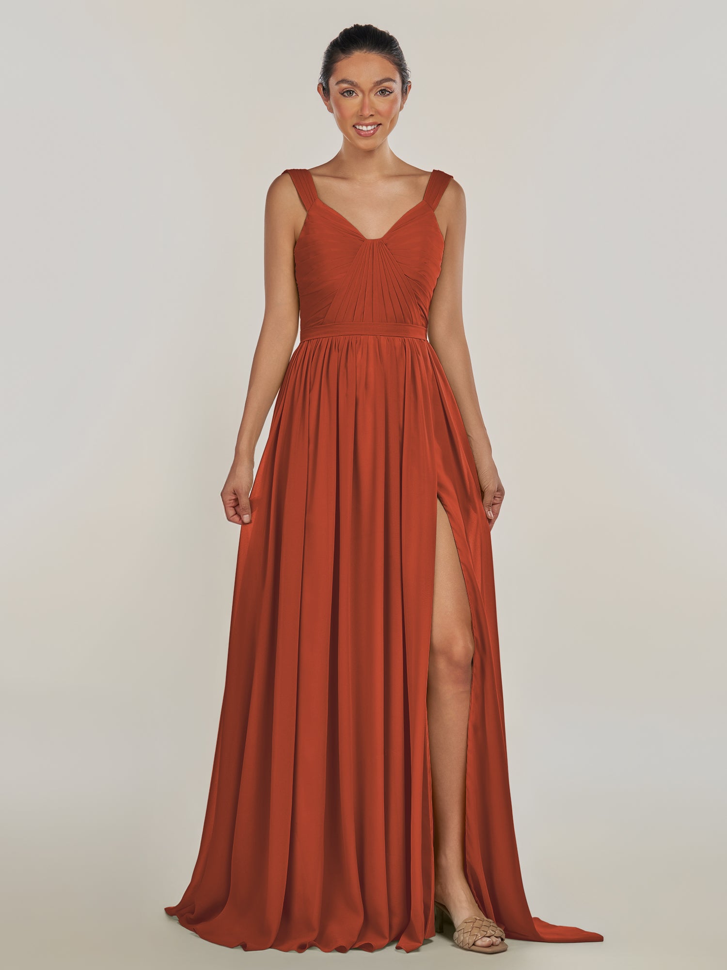 Fira | Spice - A Line Chiffon V Neck Pleated Long Bridesmaid Dress with Slit