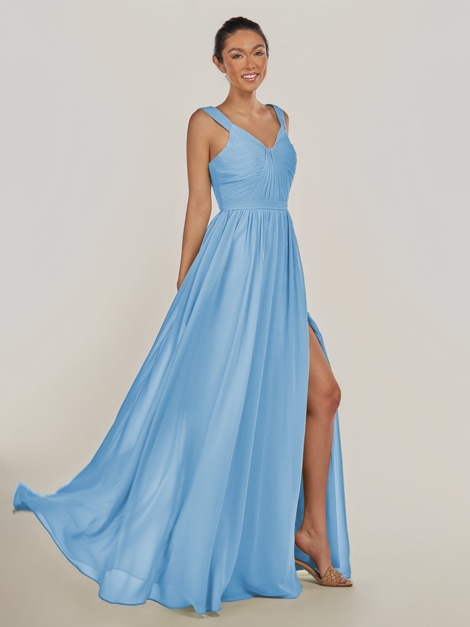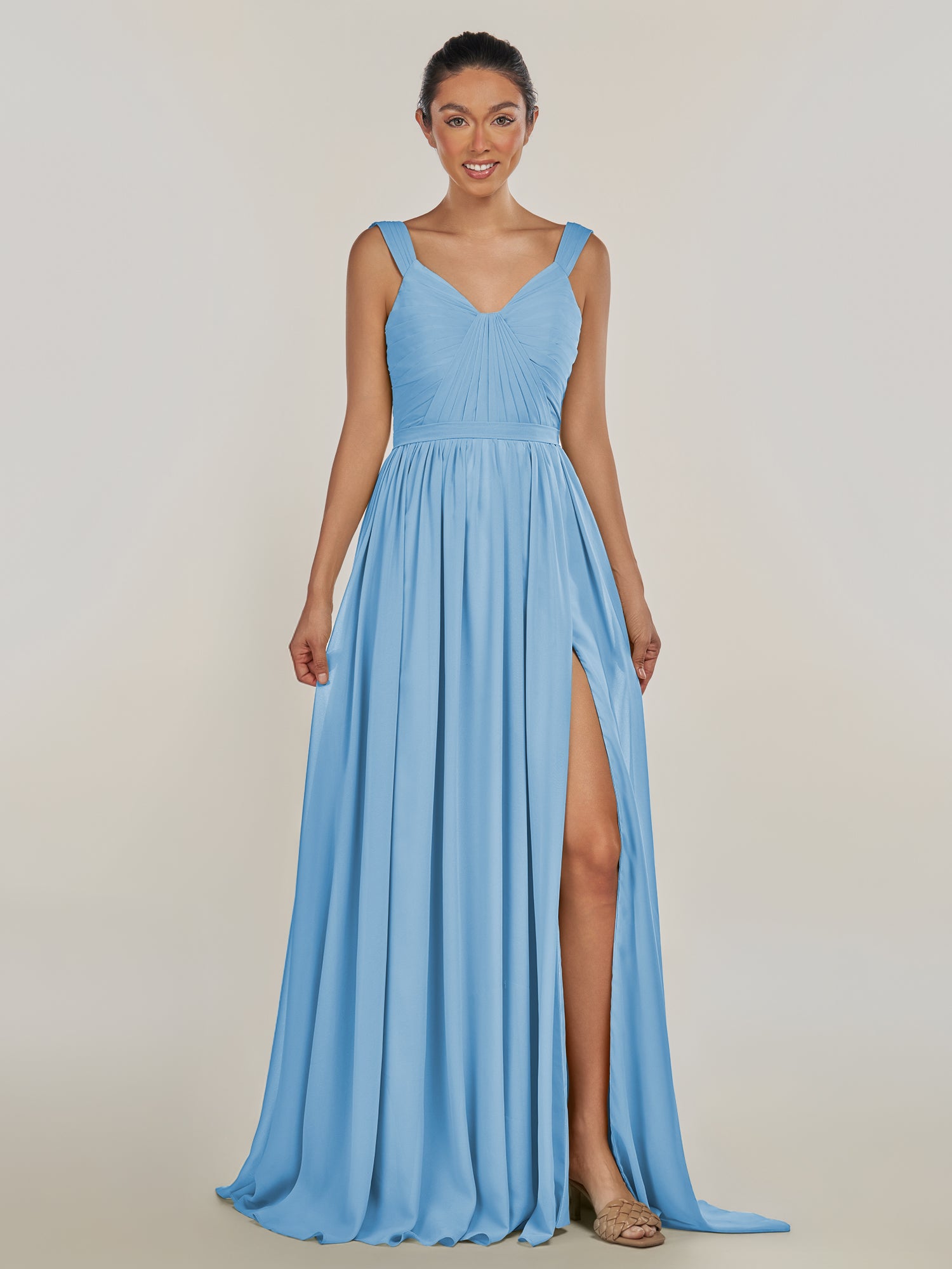 Fira | Steel Blue - A Line Chiffon V Neck Pleated Long Bridesmaid Dress with Slit