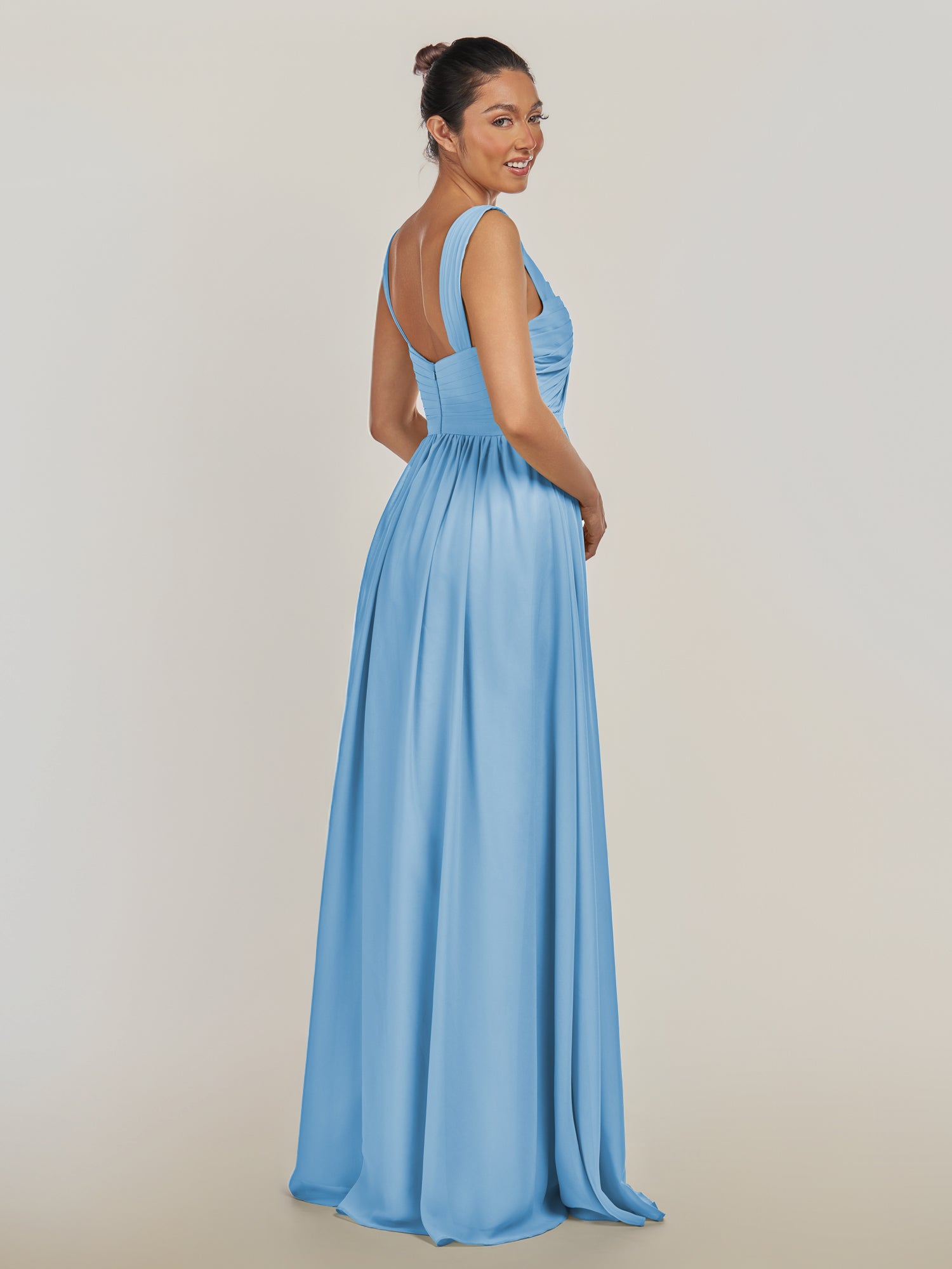 Fira is where soft romance meets timeless grace. Crafted from airy chiffon, she features a gentle V-neckline and delicate pleats that flatter every curve. Her A-line silhouette flows effortlessly to the floor, with a subtle slit that brings a modern, graceful touch. Finished with a smooth zipper back, Fira moves with poise and ease—perfect for bridesmaids who adore elegance with a fresh, refined charm.