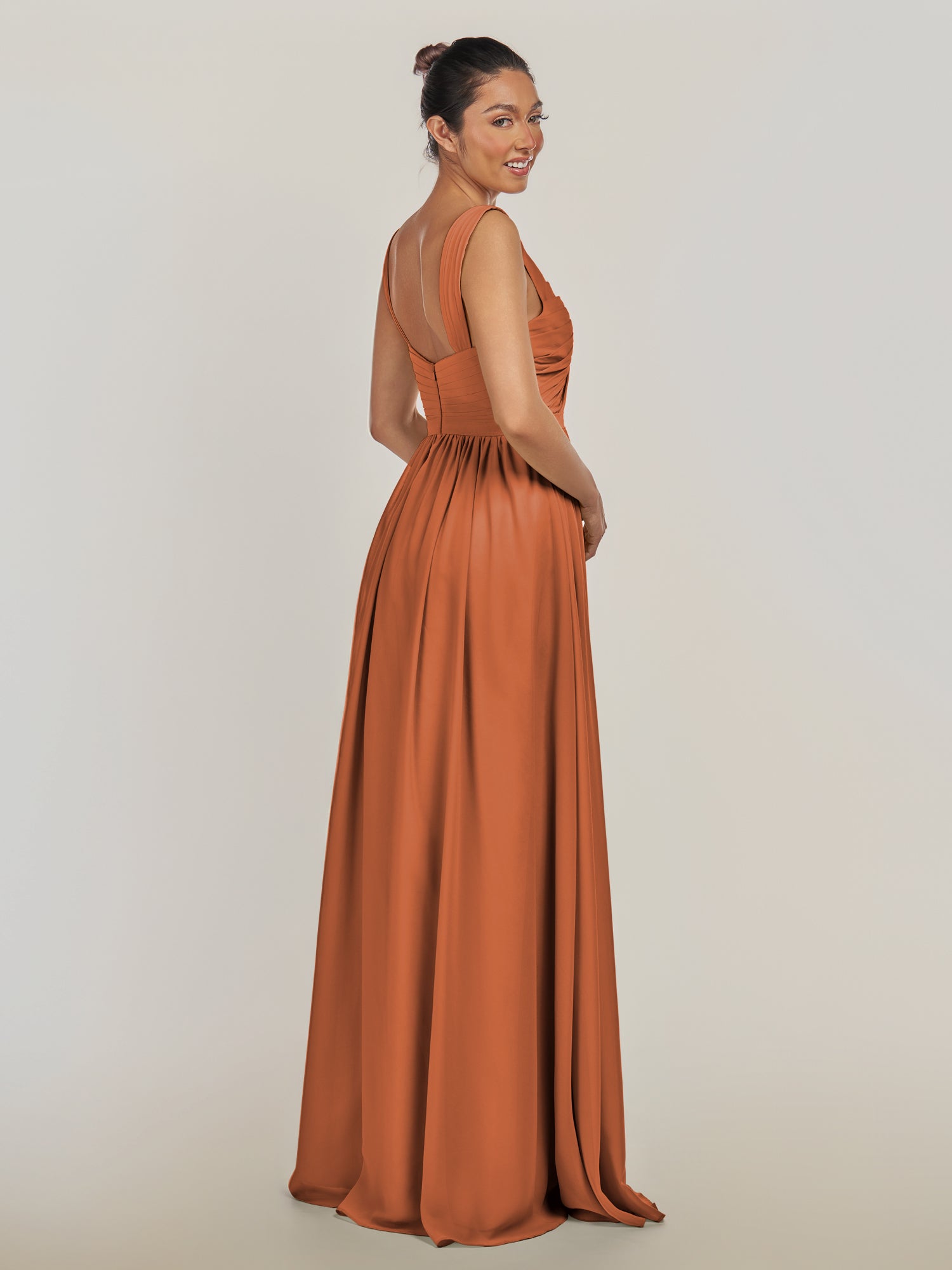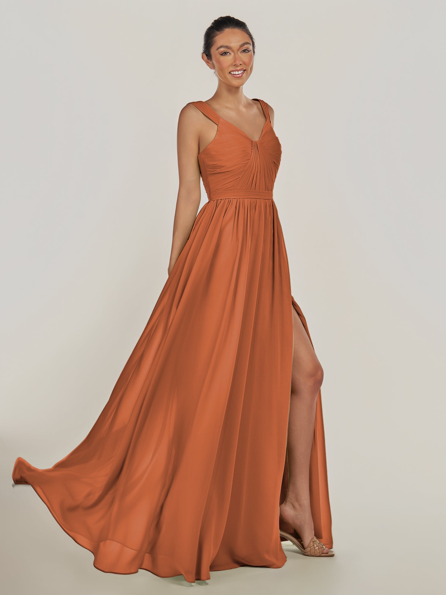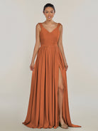 Fira | Terracotta - A Line Chiffon V Neck Pleated Long Bridesmaid Dress with Slit