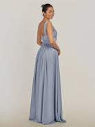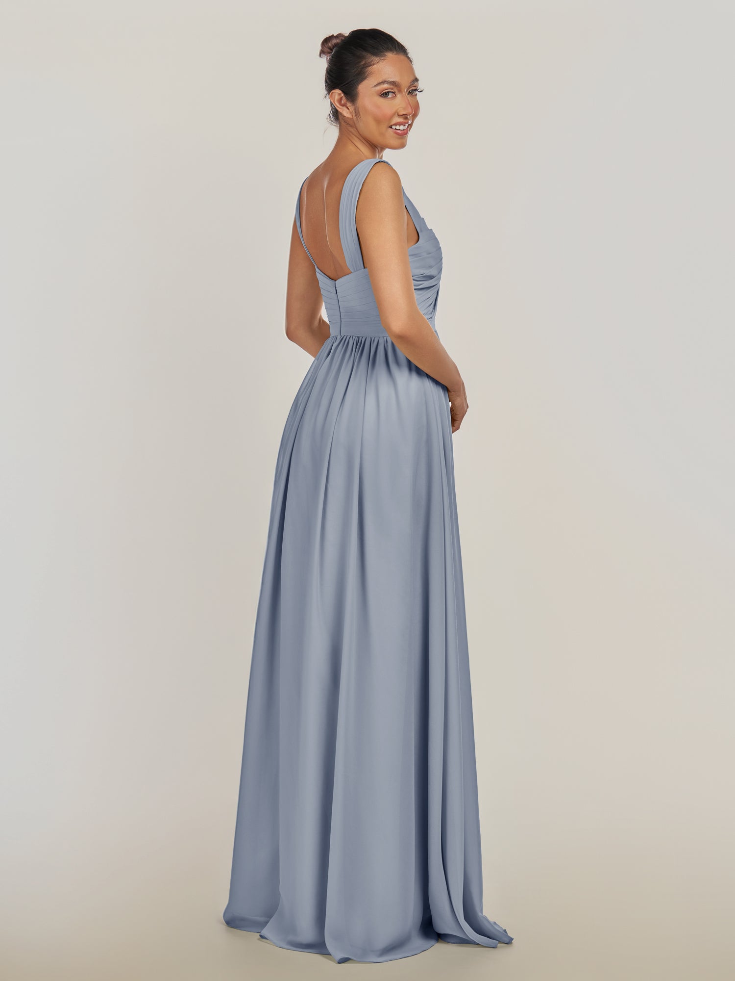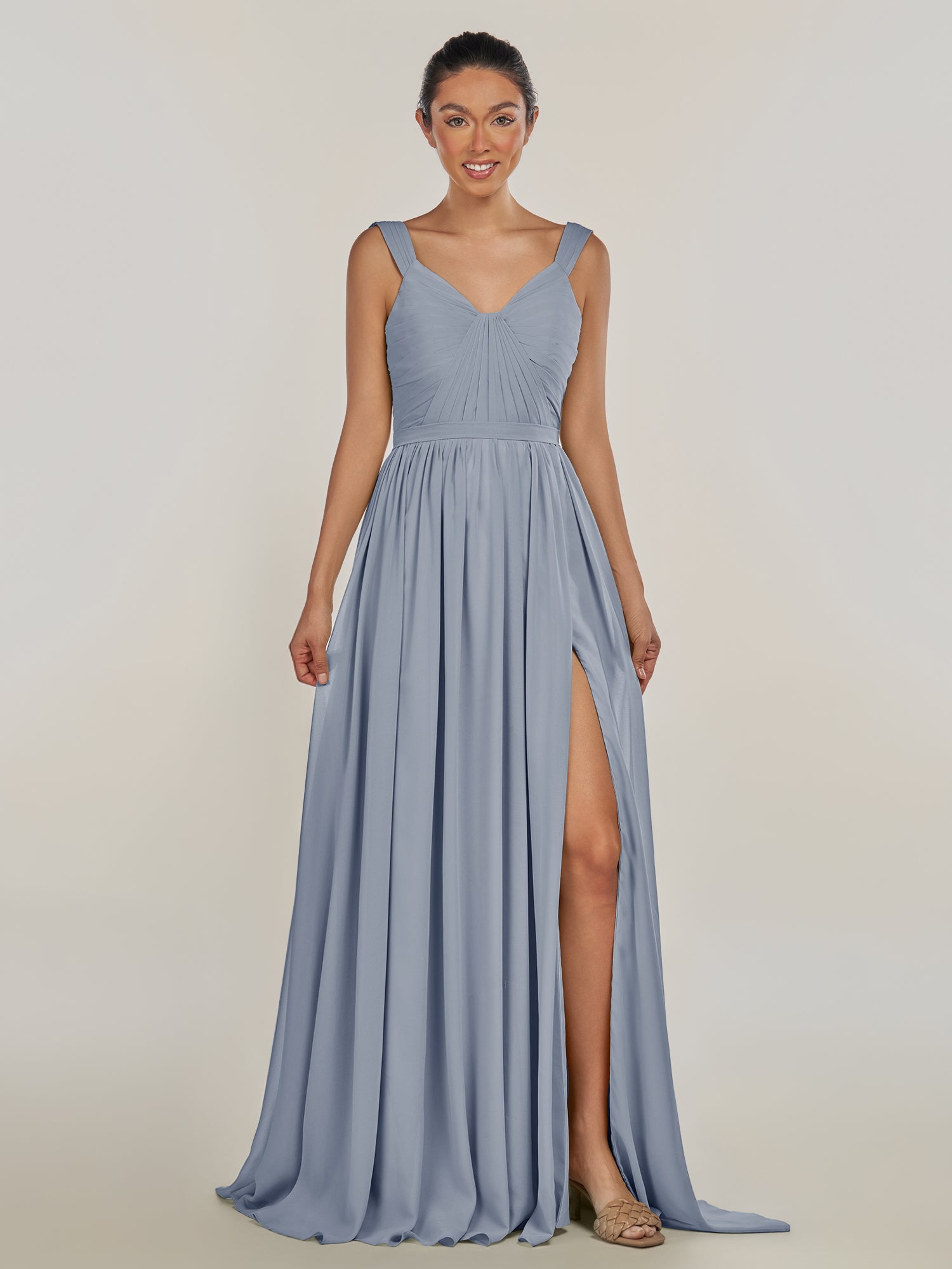 Fira is where soft romance meets timeless grace. Crafted from airy chiffon, she features a gentle V-neckline and delicate pleats that flatter every curve. Her A-line silhouette flows effortlessly to the floor, with a subtle slit that brings a modern, graceful touch. Finished with a smooth zipper back, Fira moves with poise and ease—perfect for bridesmaids who adore elegance with a fresh, refined charm.