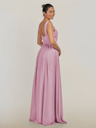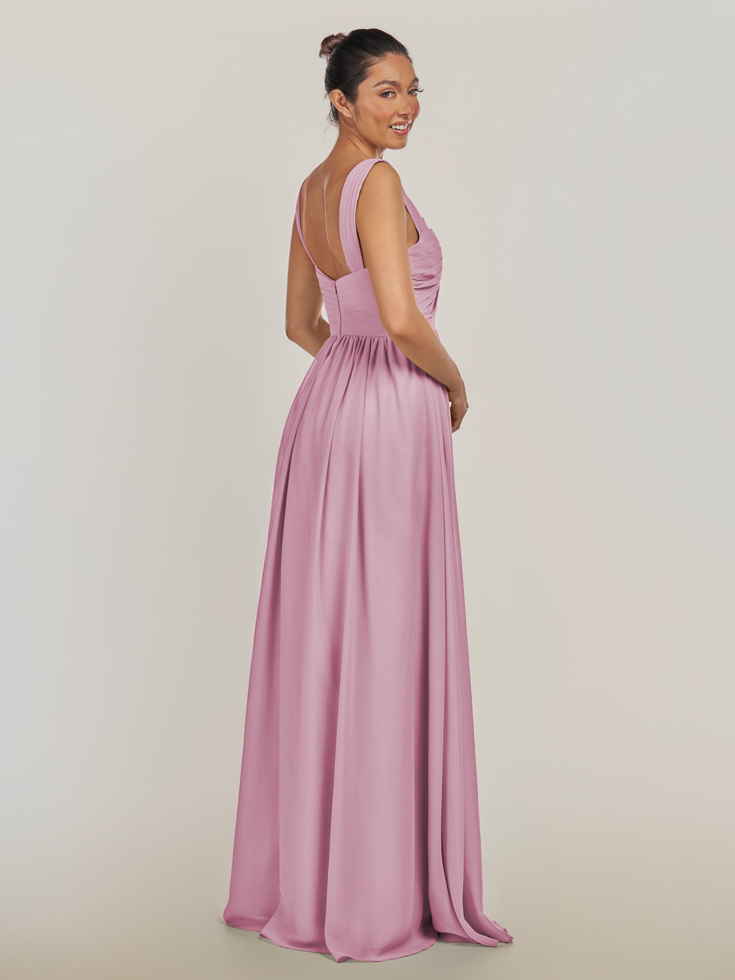 Fira is where soft romance meets timeless grace. Crafted from airy chiffon, she features a gentle V-neckline and delicate pleats that flatter every curve. Her A-line silhouette flows effortlessly to the floor, with a subtle slit that brings a modern, graceful touch. Finished with a smooth zipper back, Fira moves with poise and ease—perfect for bridesmaids who adore elegance with a fresh, refined charm.