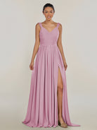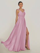 Fira | Vintage Mauve - A Line Chiffon V Neck Pleated Long Bridesmaid Dress with Slit