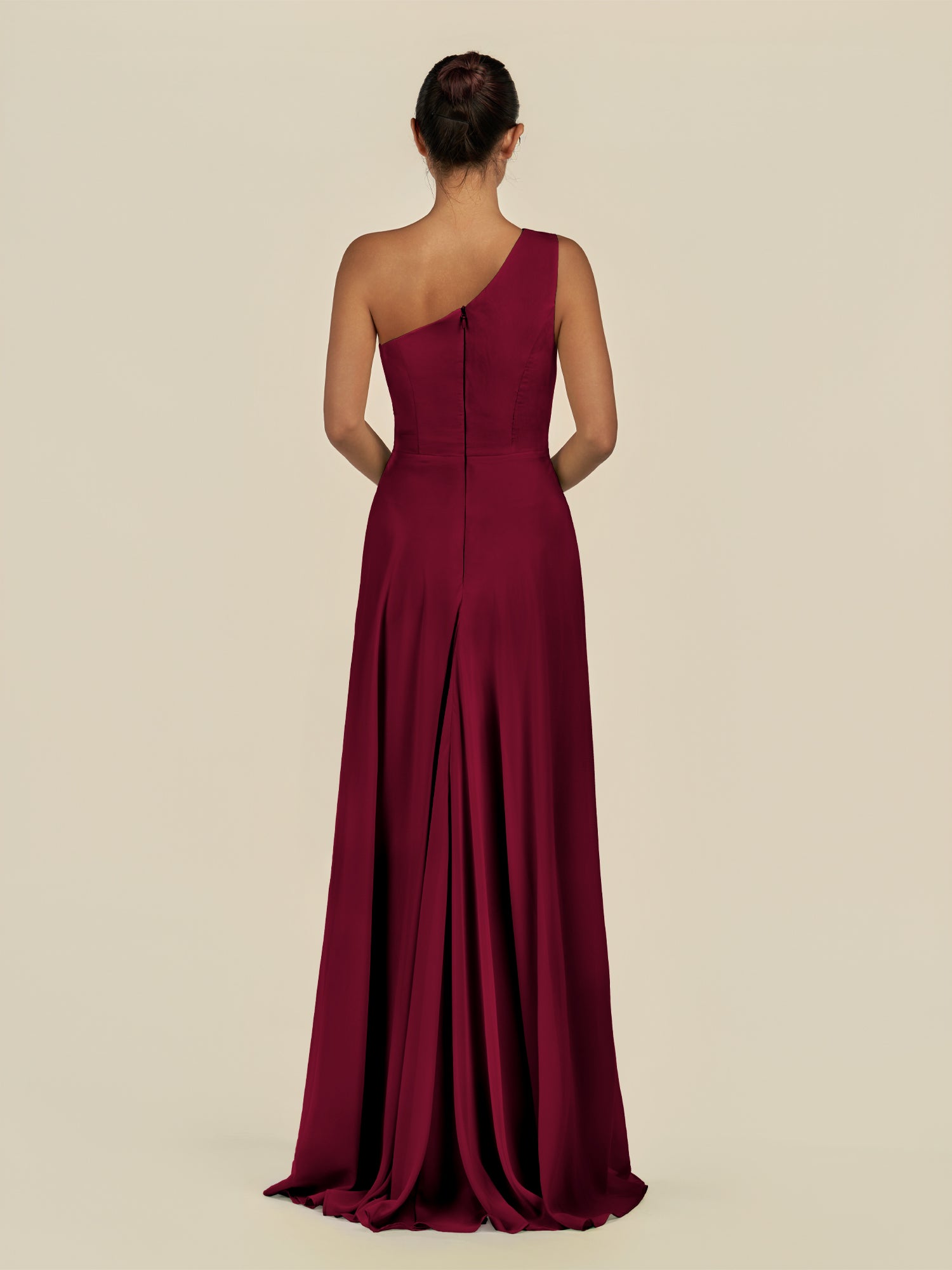 Gaela radiates contemporary elegance with a touch of sophistication. Crafted from soft chiffon, she features a one-shoulder neckline that highlights the décolletage gracefully. Her floor-length A-line skirt flows beautifully, enhanced by delicate pleats and a subtle side slit for effortless movement. Finished with a smooth zipper back, Gaela is perfect for bridesmaids seeking a refined and modern silhouette.