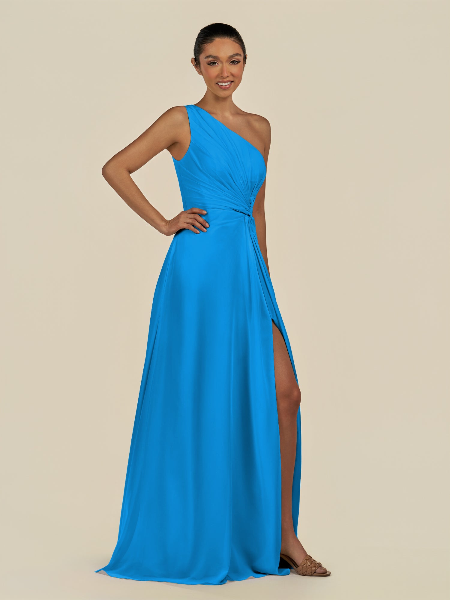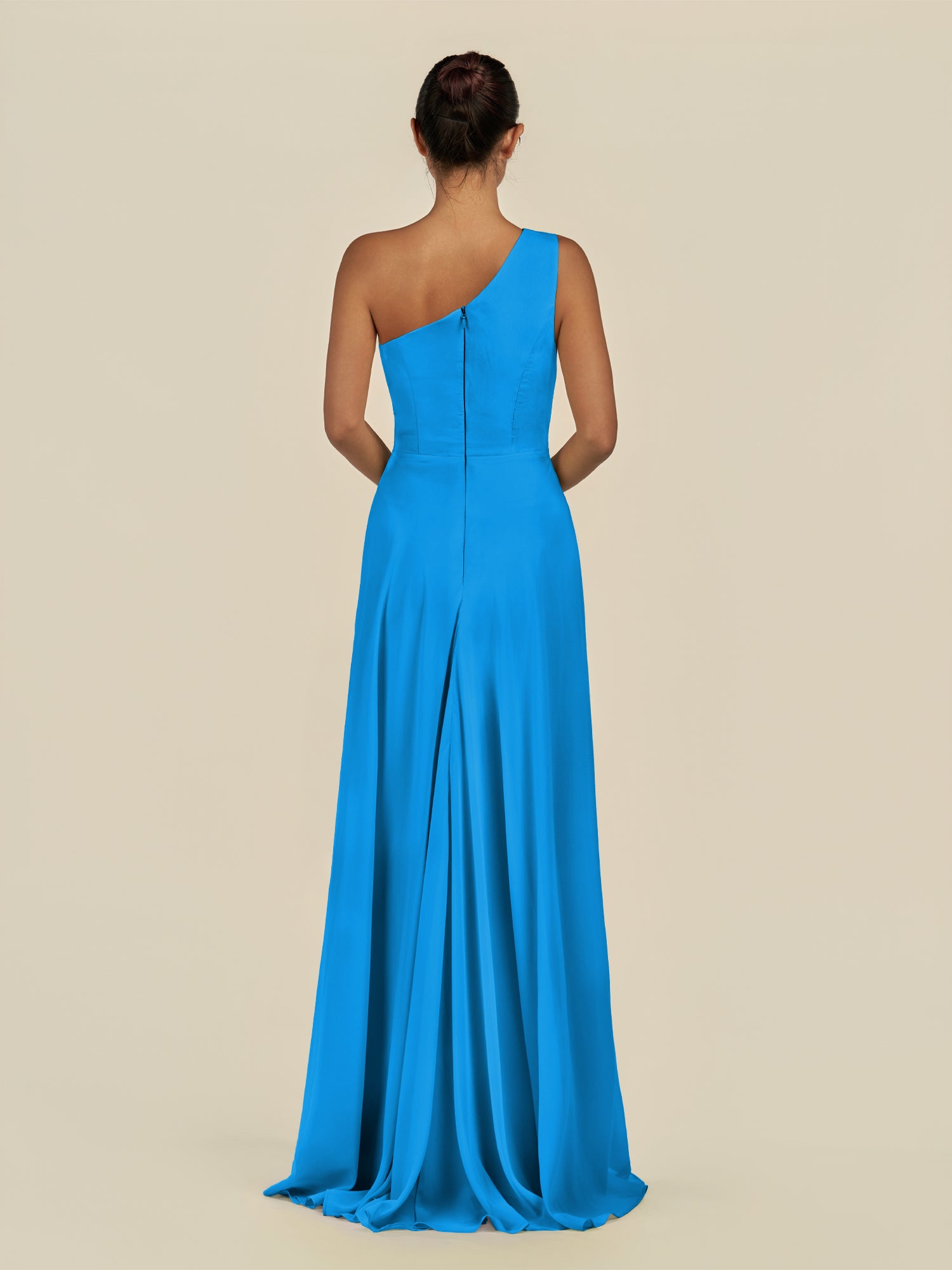 Gaela radiates contemporary elegance with a touch of sophistication. Crafted from soft chiffon, she features a one-shoulder neckline that highlights the décolletage gracefully. Her floor-length A-line skirt flows beautifully, enhanced by delicate pleats and a subtle side slit for effortless movement. Finished with a smooth zipper back, Gaela is perfect for bridesmaids seeking a refined and modern silhouette.