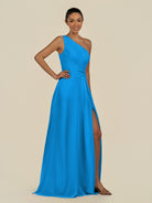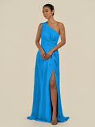 Gaela | Blue Jay - A Line One Shoulder Chiffon Pleated Long Bridesmaid Dress with Slit