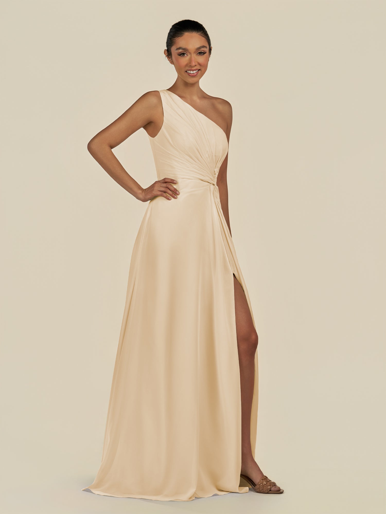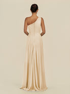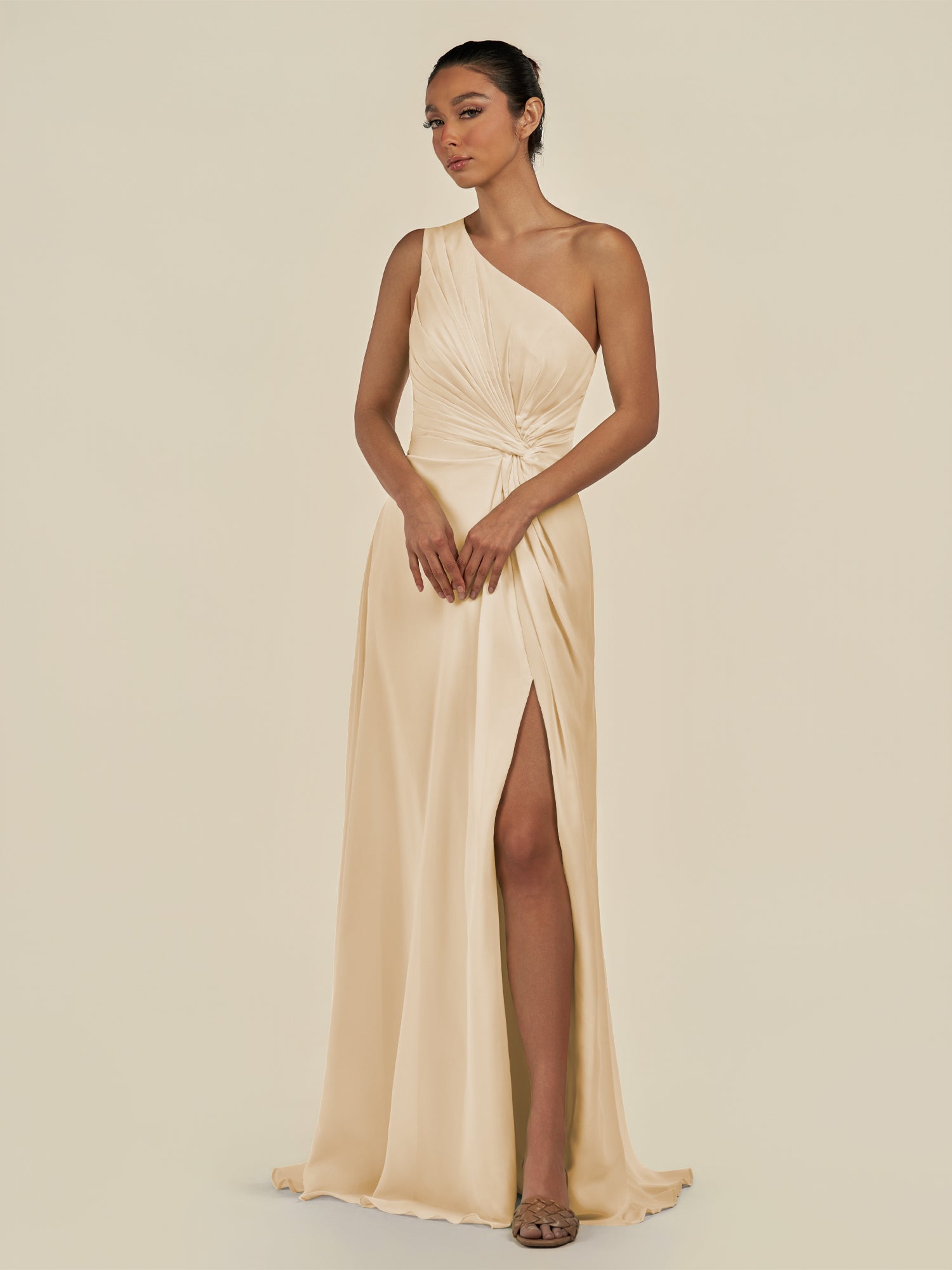 Gaela | Champagne - A Line One Shoulder Chiffon Pleated Long Bridesmaid Dress with Slit