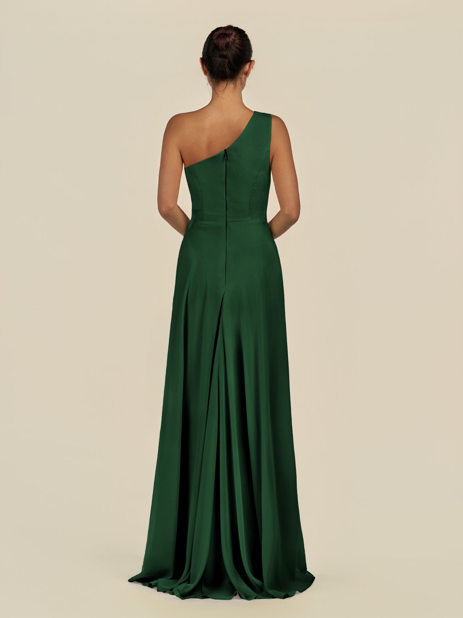 Gaela radiates contemporary elegance with a touch of sophistication. Crafted from soft chiffon, she features a one-shoulder neckline that highlights the décolletage gracefully. Her floor-length A-line skirt flows beautifully, enhanced by delicate pleats and a subtle side slit for effortless movement. Finished with a smooth zipper back, Gaela is perfect for bridesmaids seeking a refined and modern silhouette.