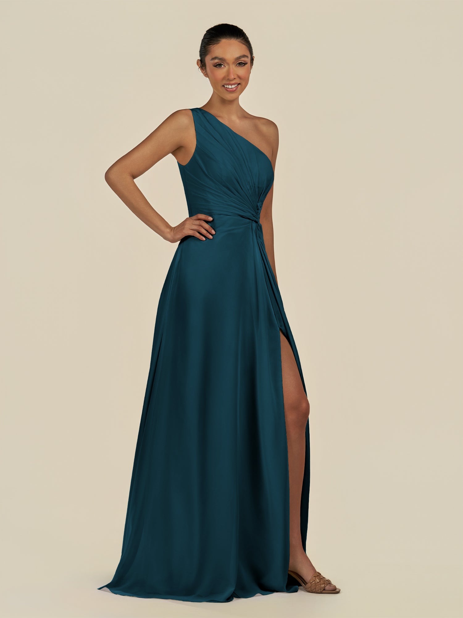 Gaela radiates contemporary elegance with a touch of sophistication. Crafted from soft chiffon, she features a one-shoulder neckline that highlights the décolletage gracefully. Her floor-length A-line skirt flows beautifully, enhanced by delicate pleats and a subtle side slit for effortless movement. Finished with a smooth zipper back, Gaela is perfect for bridesmaids seeking a refined and modern silhouette.
