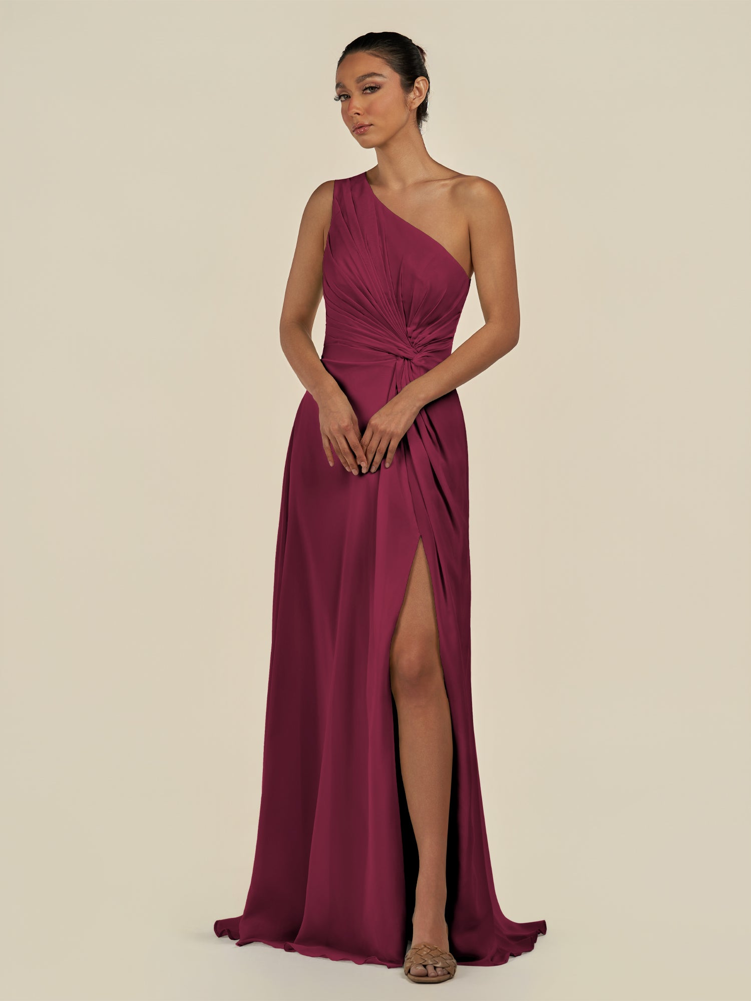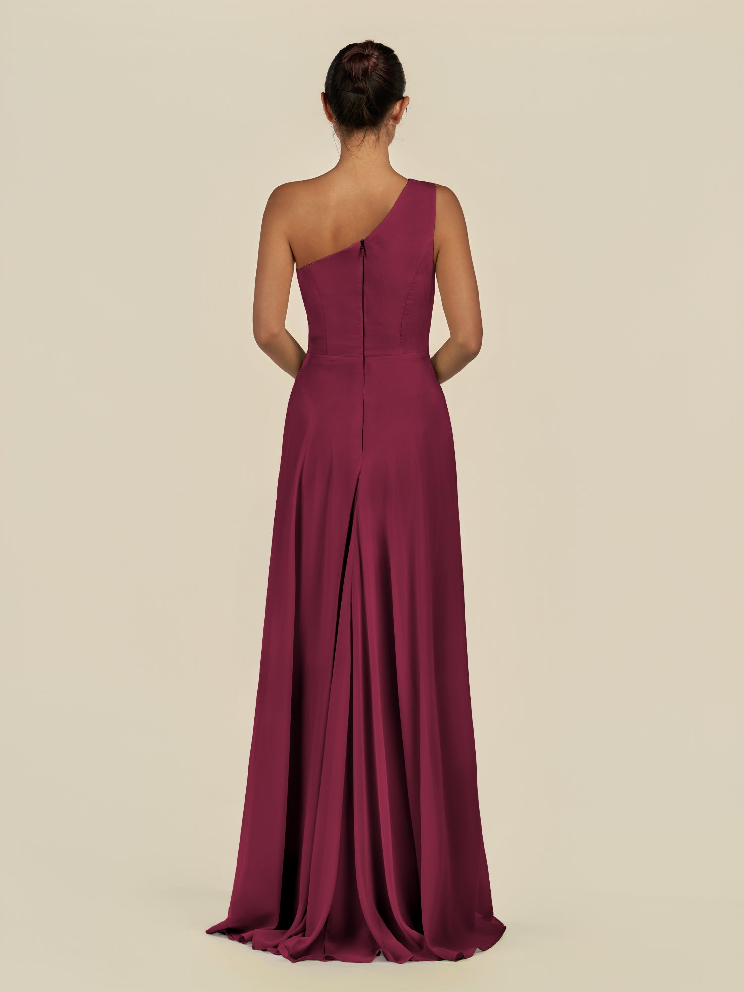 Gaela radiates contemporary elegance with a touch of sophistication. Crafted from soft chiffon, she features a one-shoulder neckline that highlights the décolletage gracefully. Her floor-length A-line skirt flows beautifully, enhanced by delicate pleats and a subtle side slit for effortless movement. Finished with a smooth zipper back, Gaela is perfect for bridesmaids seeking a refined and modern silhouette.