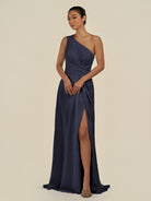 Gaela | Dusk Blue - A Line One Shoulder Chiffon Pleated Long Bridesmaid Dress with Slit