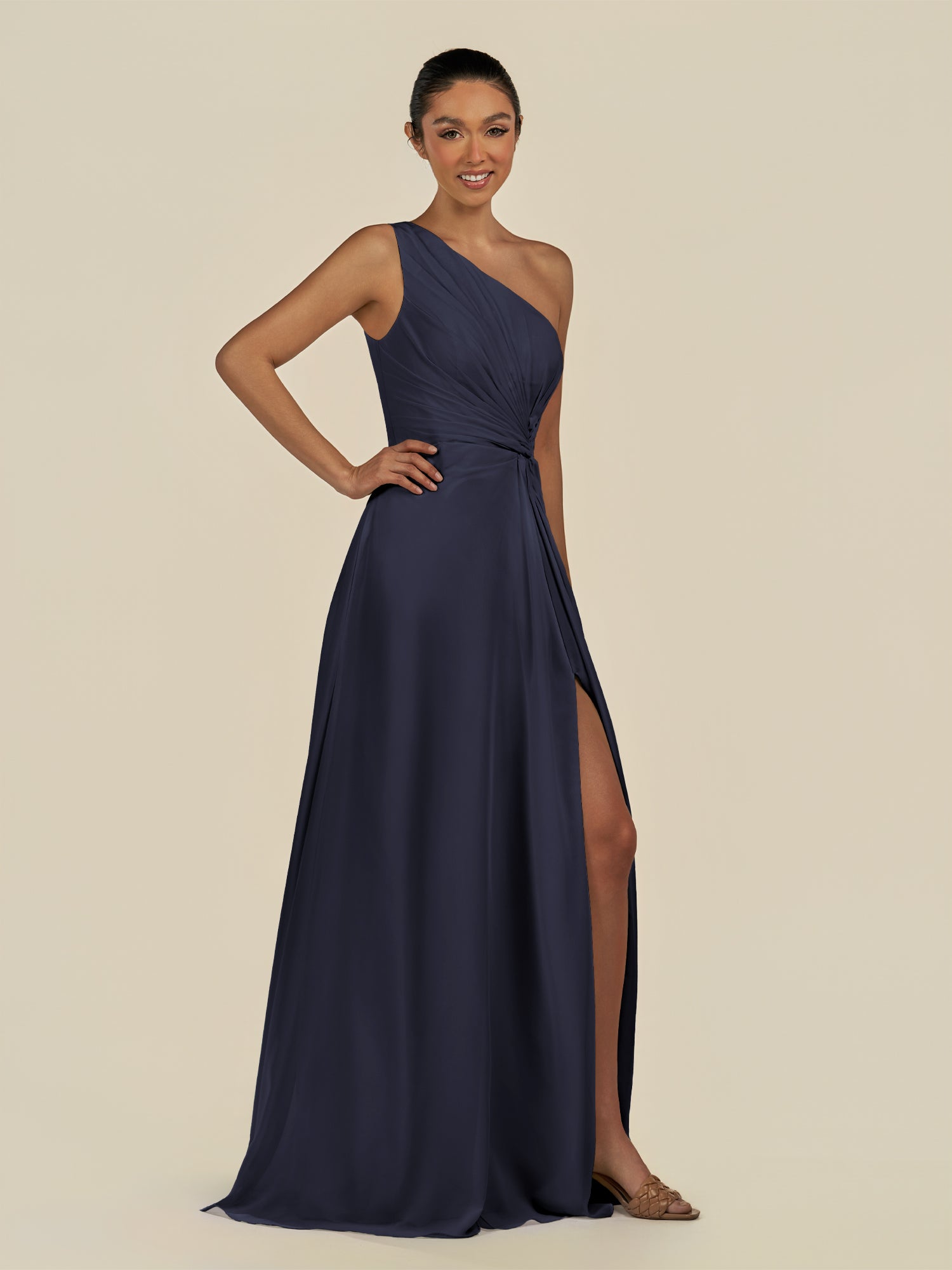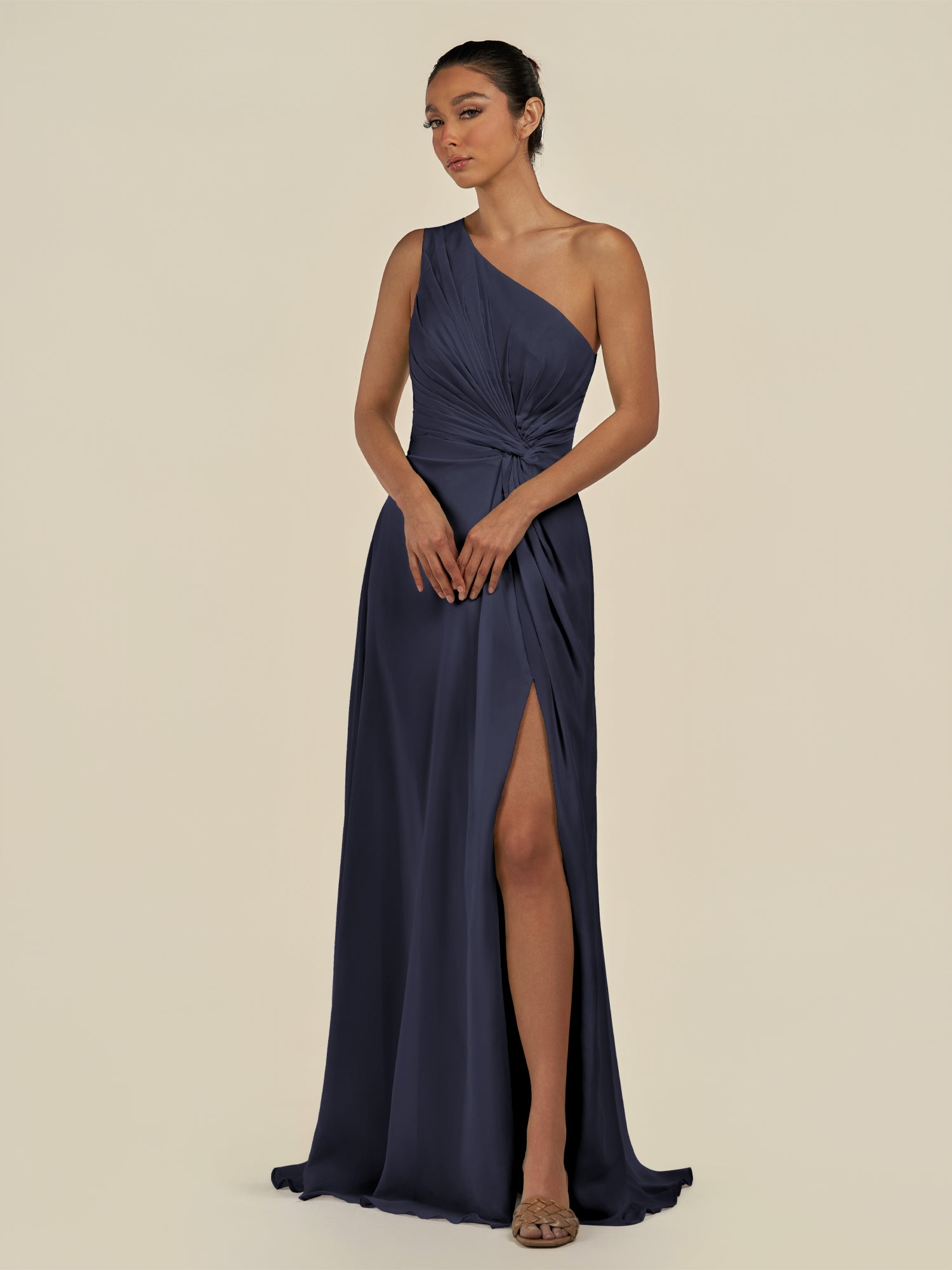 Gaela radiates contemporary elegance with a touch of sophistication. Crafted from soft chiffon, she features a one-shoulder neckline that highlights the décolletage gracefully. Her floor-length A-line skirt flows beautifully, enhanced by delicate pleats and a subtle side slit for effortless movement. Finished with a smooth zipper back, Gaela is perfect for bridesmaids seeking a refined and modern silhouette.