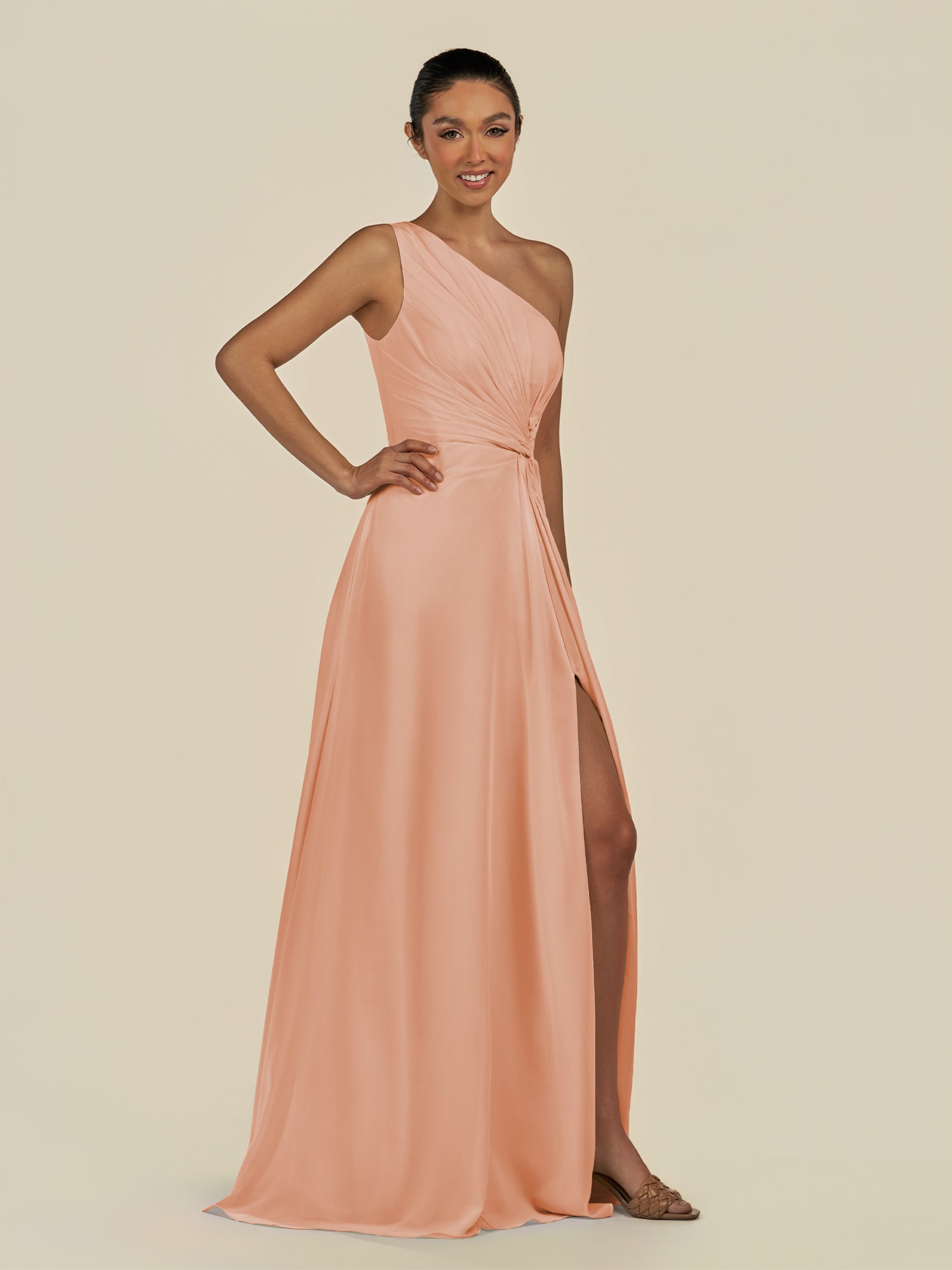 Gaela radiates contemporary elegance with a touch of sophistication. Crafted from soft chiffon, she features a one-shoulder neckline that highlights the décolletage gracefully. Her floor-length A-line skirt flows beautifully, enhanced by delicate pleats and a subtle side slit for effortless movement. Finished with a smooth zipper back, Gaela is perfect for bridesmaids seeking a refined and modern silhouette.