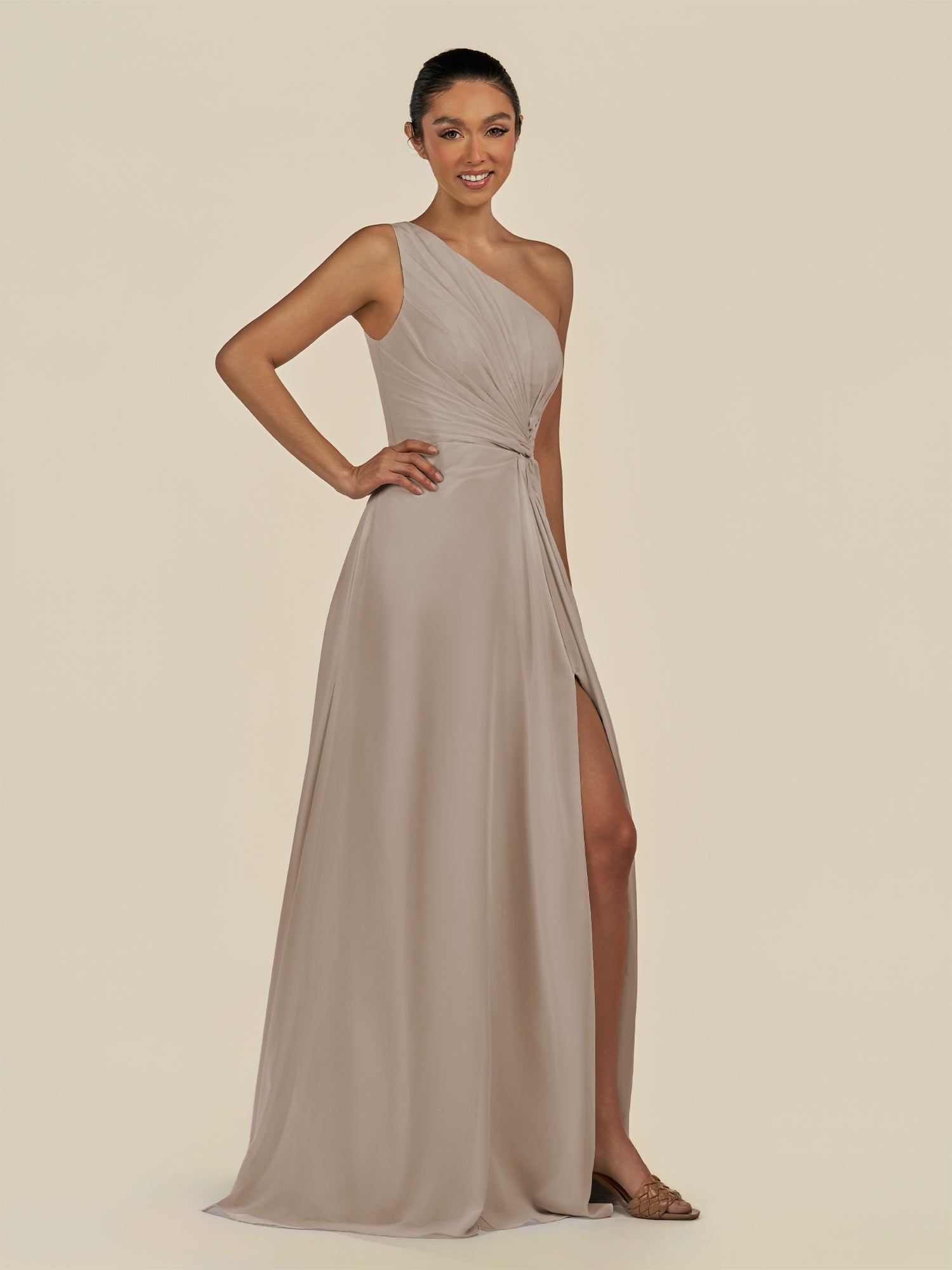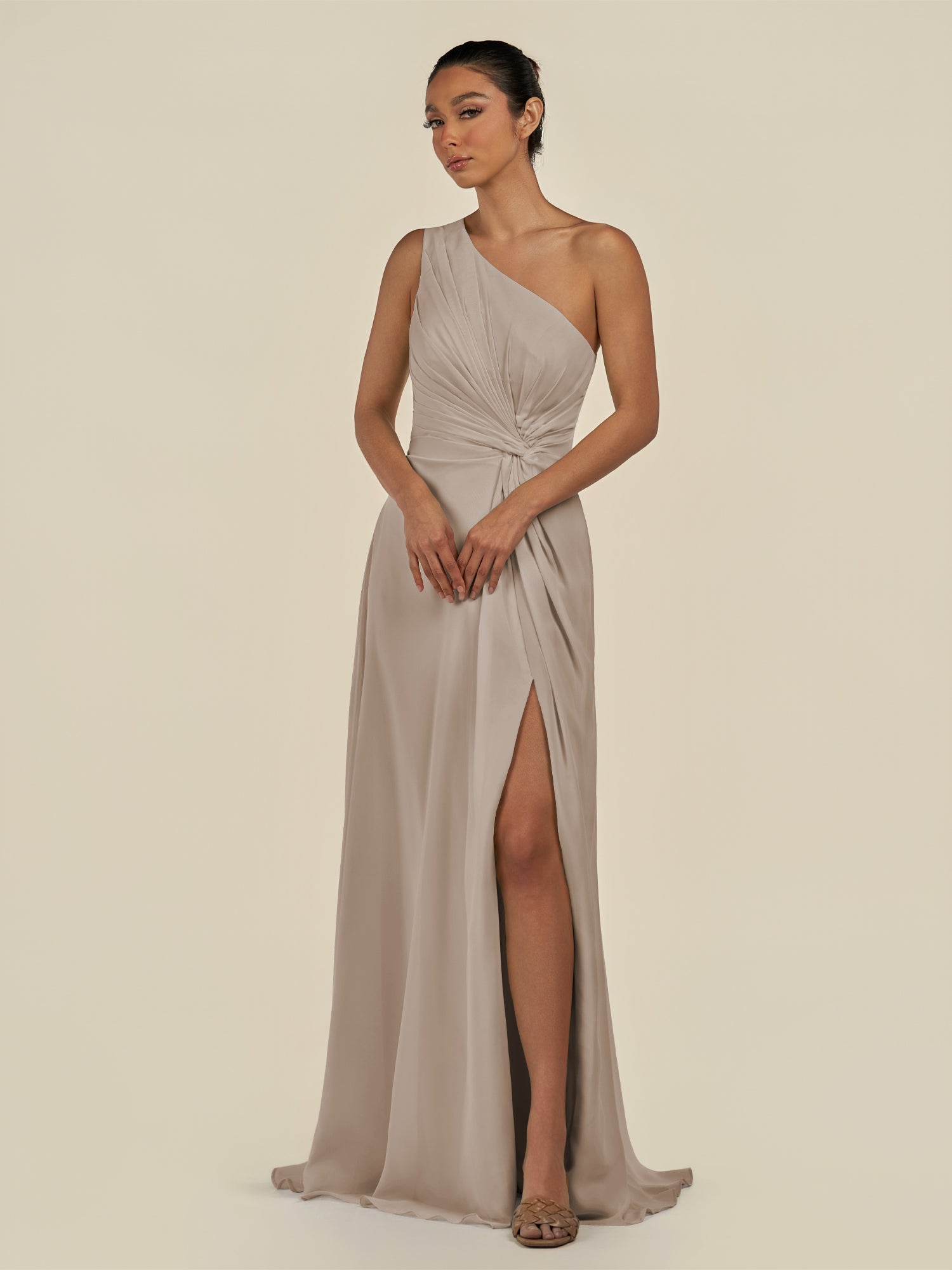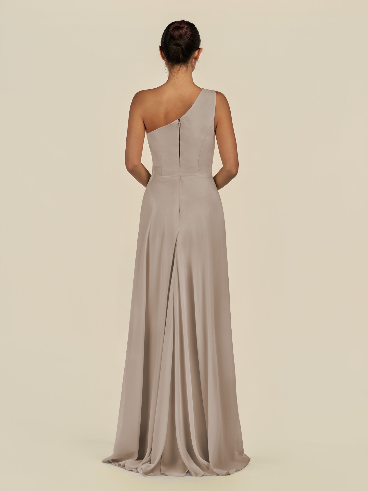 Gaela radiates contemporary elegance with a touch of sophistication. Crafted from soft chiffon, she features a one-shoulder neckline that highlights the décolletage gracefully. Her floor-length A-line skirt flows beautifully, enhanced by delicate pleats and a subtle side slit for effortless movement. Finished with a smooth zipper back, Gaela is perfect for bridesmaids seeking a refined and modern silhouette.