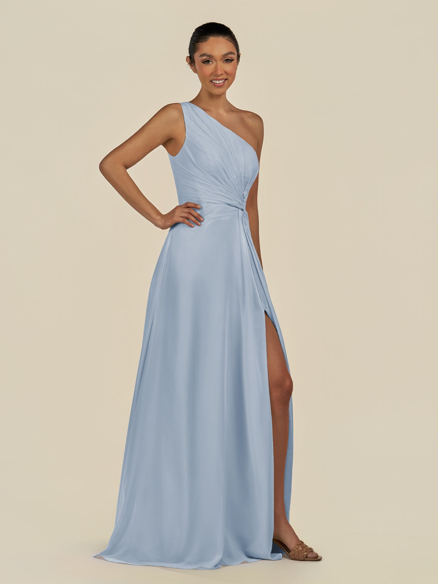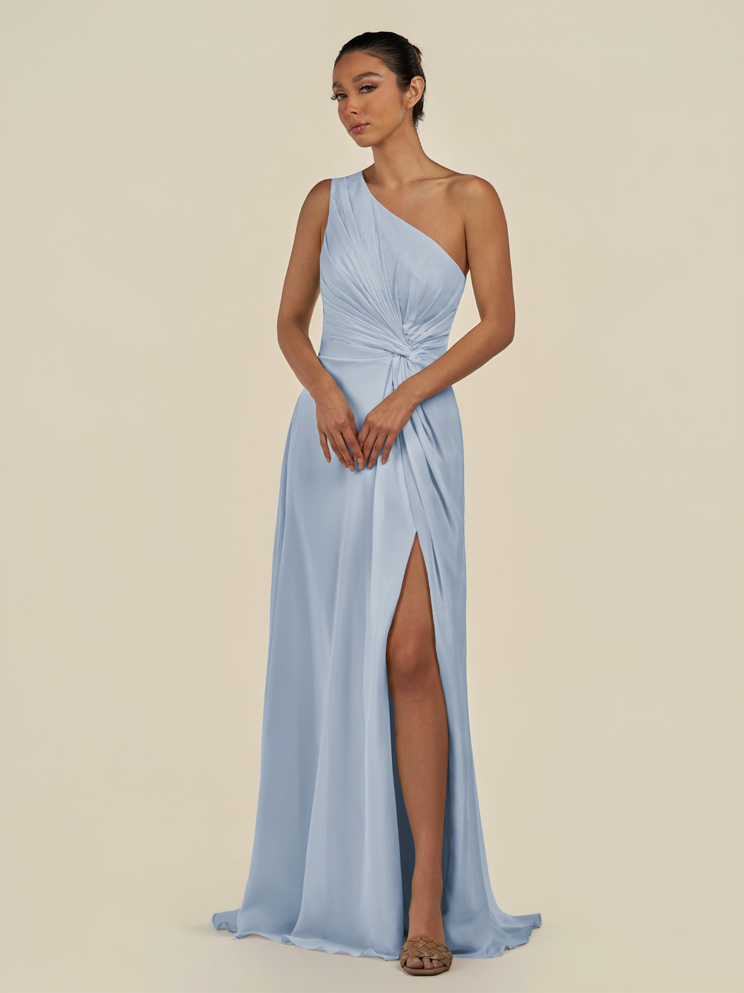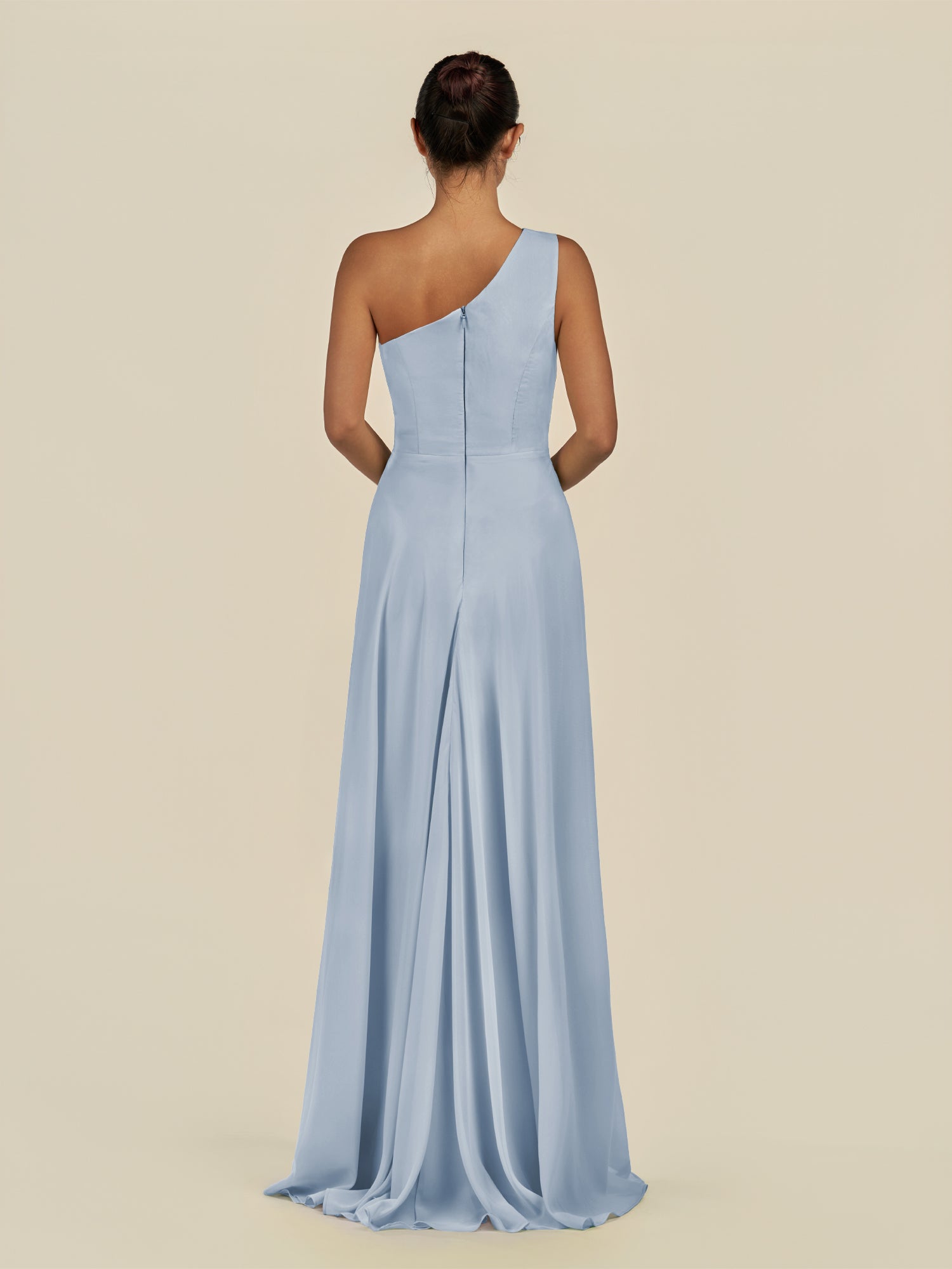 Gaela radiates contemporary elegance with a touch of sophistication. Crafted from soft chiffon, she features a one-shoulder neckline that highlights the décolletage gracefully. Her floor-length A-line skirt flows beautifully, enhanced by delicate pleats and a subtle side slit for effortless movement. Finished with a smooth zipper back, Gaela is perfect for bridesmaids seeking a refined and modern silhouette.