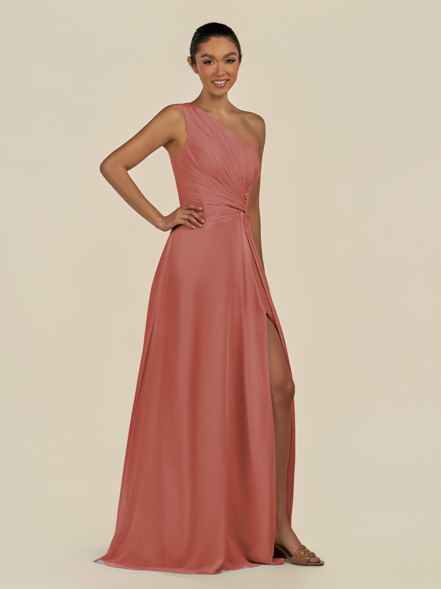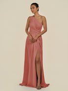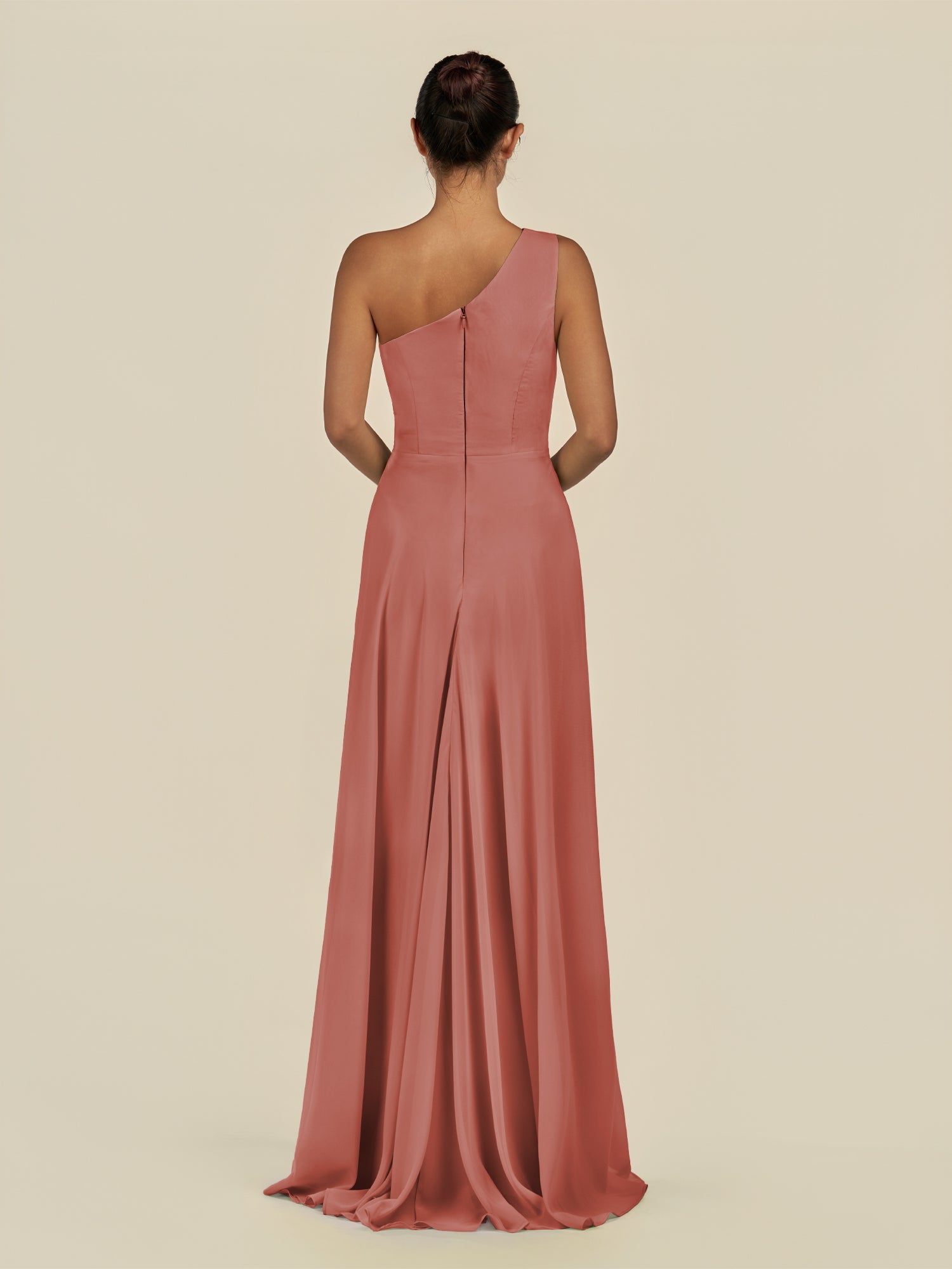 Gaela radiates contemporary elegance with a touch of sophistication. Crafted from soft chiffon, she features a one-shoulder neckline that highlights the décolletage gracefully. Her floor-length A-line skirt flows beautifully, enhanced by delicate pleats and a subtle side slit for effortless movement. Finished with a smooth zipper back, Gaela is perfect for bridesmaids seeking a refined and modern silhouette.