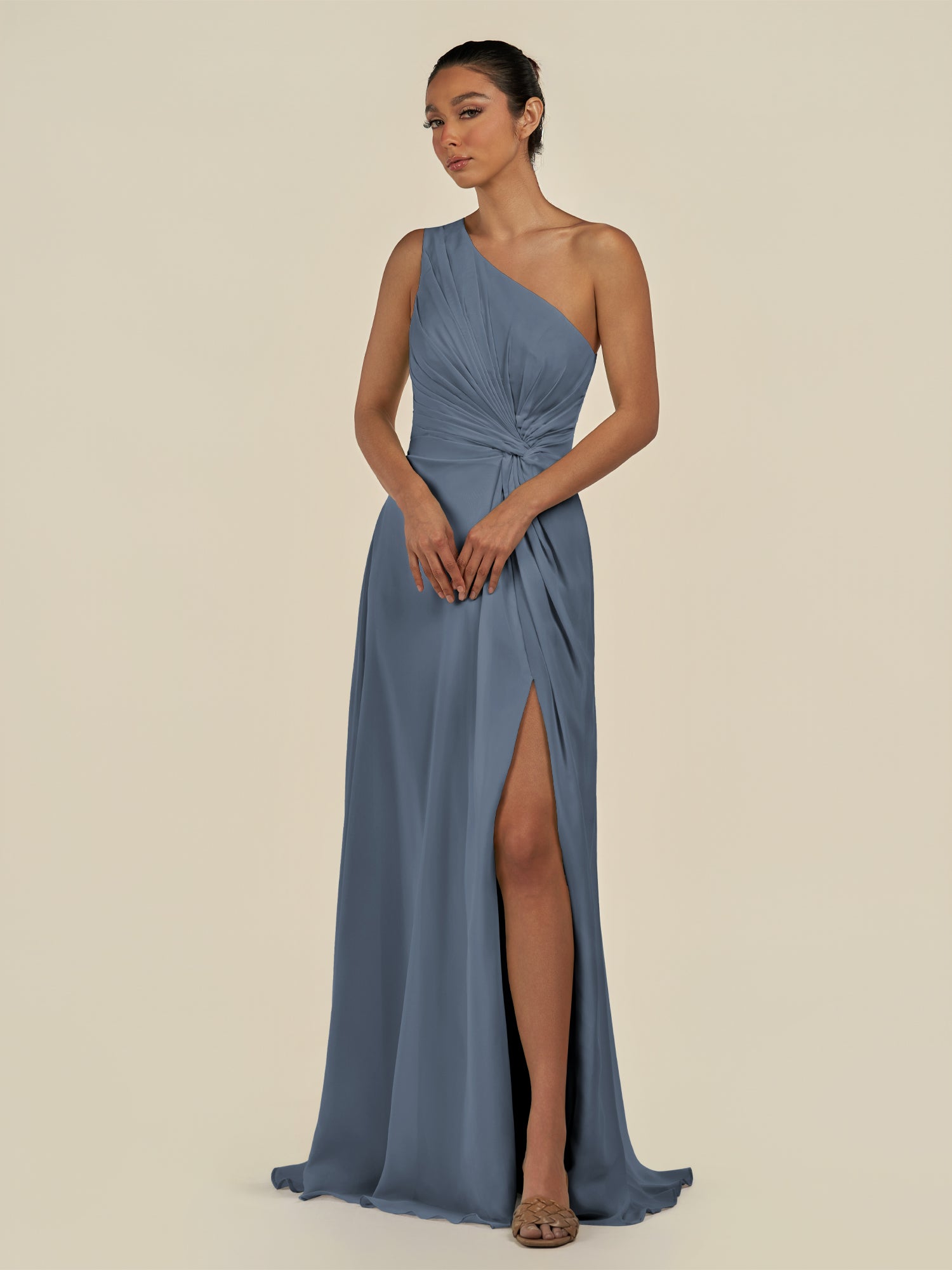 Gaela | Neptune - A Line One Shoulder Chiffon Pleated Long Bridesmaid Dress with Slit