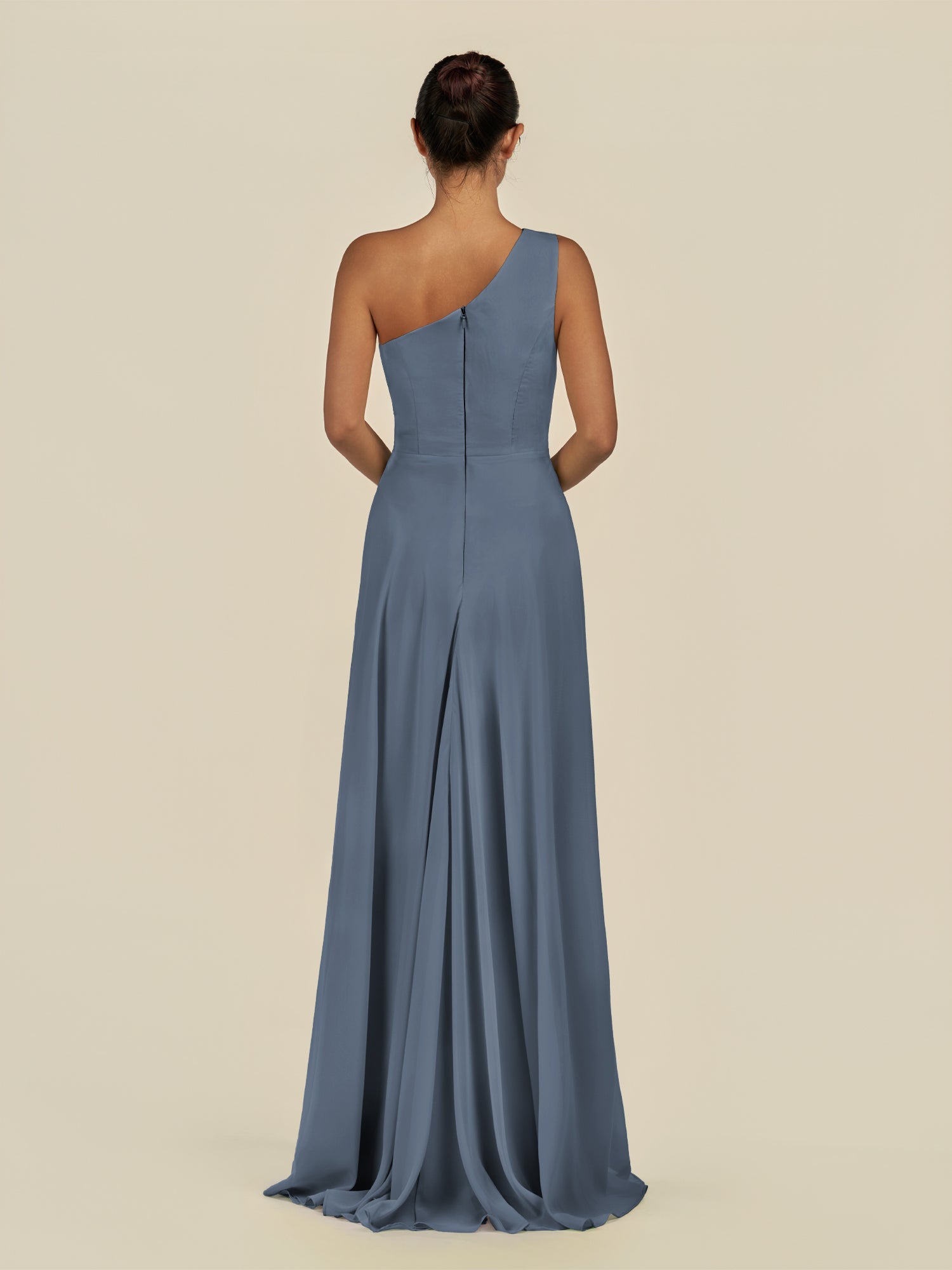 Gaela radiates contemporary elegance with a touch of sophistication. Crafted from soft chiffon, she features a one-shoulder neckline that highlights the décolletage gracefully. Her floor-length A-line skirt flows beautifully, enhanced by delicate pleats and a subtle side slit for effortless movement. Finished with a smooth zipper back, Gaela is perfect for bridesmaids seeking a refined and modern silhouette.