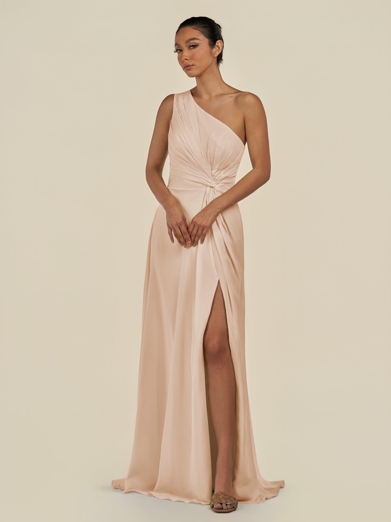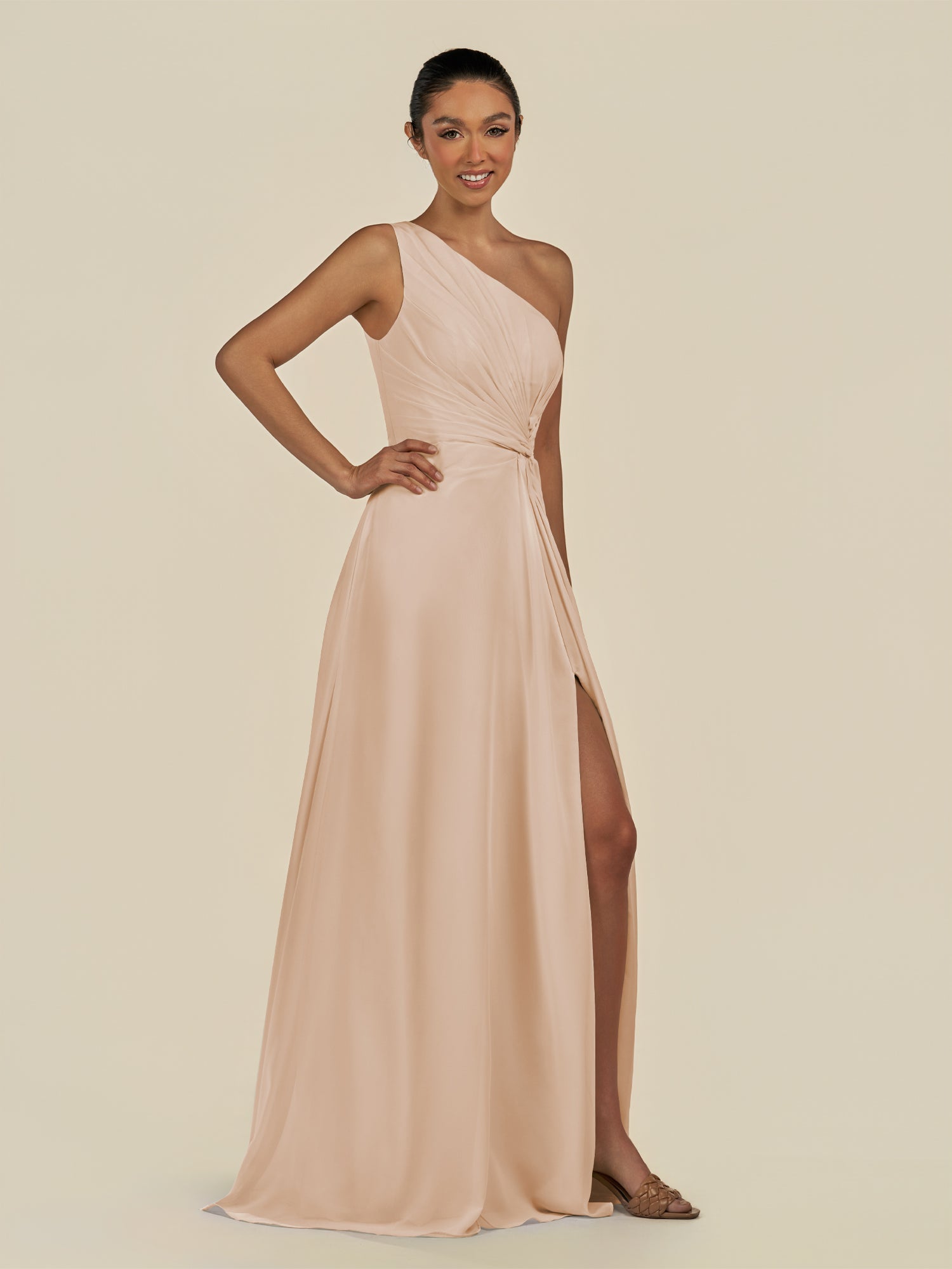 Gaela radiates contemporary elegance with a touch of sophistication. Crafted from soft chiffon, she features a one-shoulder neckline that highlights the décolletage gracefully. Her floor-length A-line skirt flows beautifully, enhanced by delicate pleats and a subtle side slit for effortless movement. Finished with a smooth zipper back, Gaela is perfect for bridesmaids seeking a refined and modern silhouette.