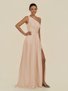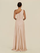 Gaela | Pale Blush - A Line One Shoulder Chiffon Pleated Long Bridesmaid Dress with Slit