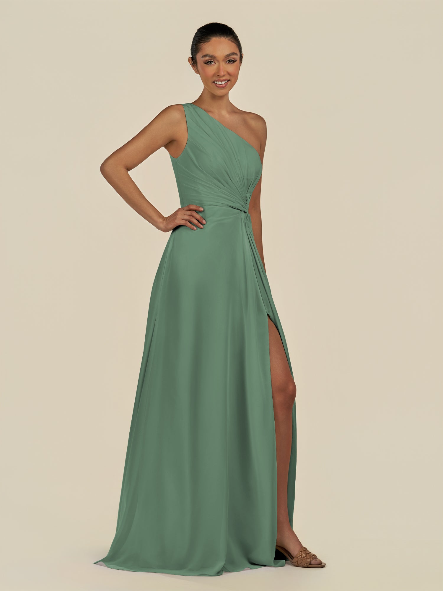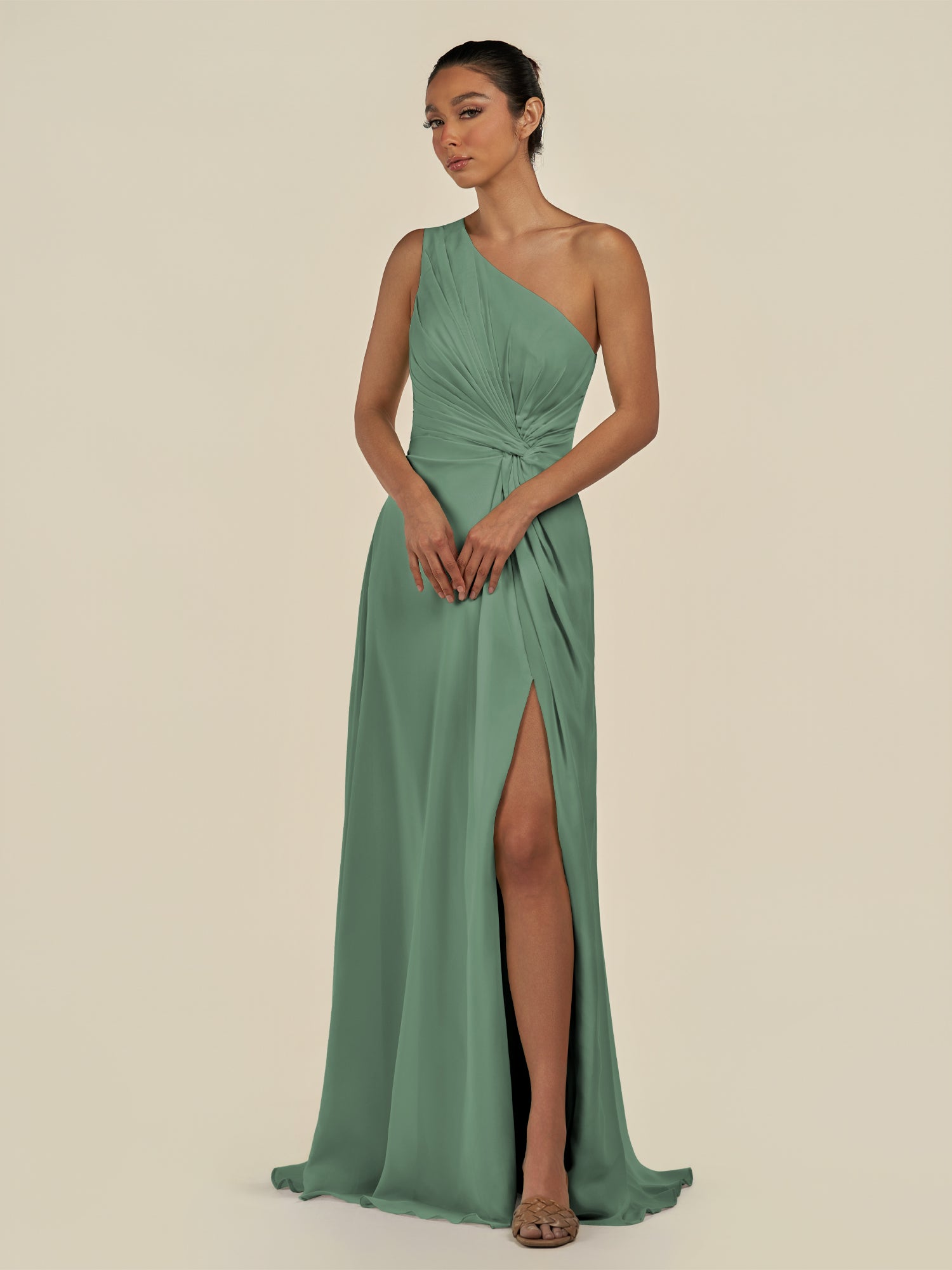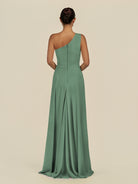 Gaela | Sea Glass - A Line One Shoulder Chiffon Pleated Long Bridesmaid Dress with Slit