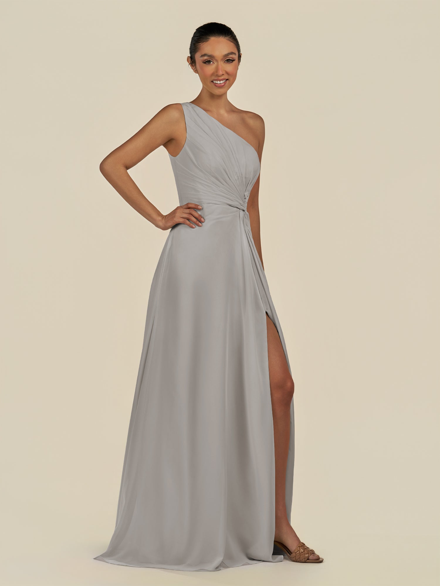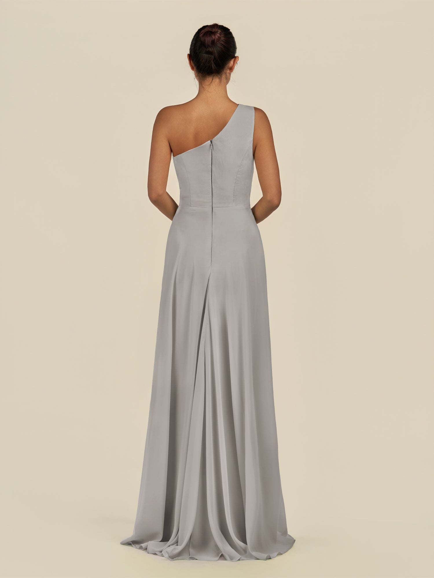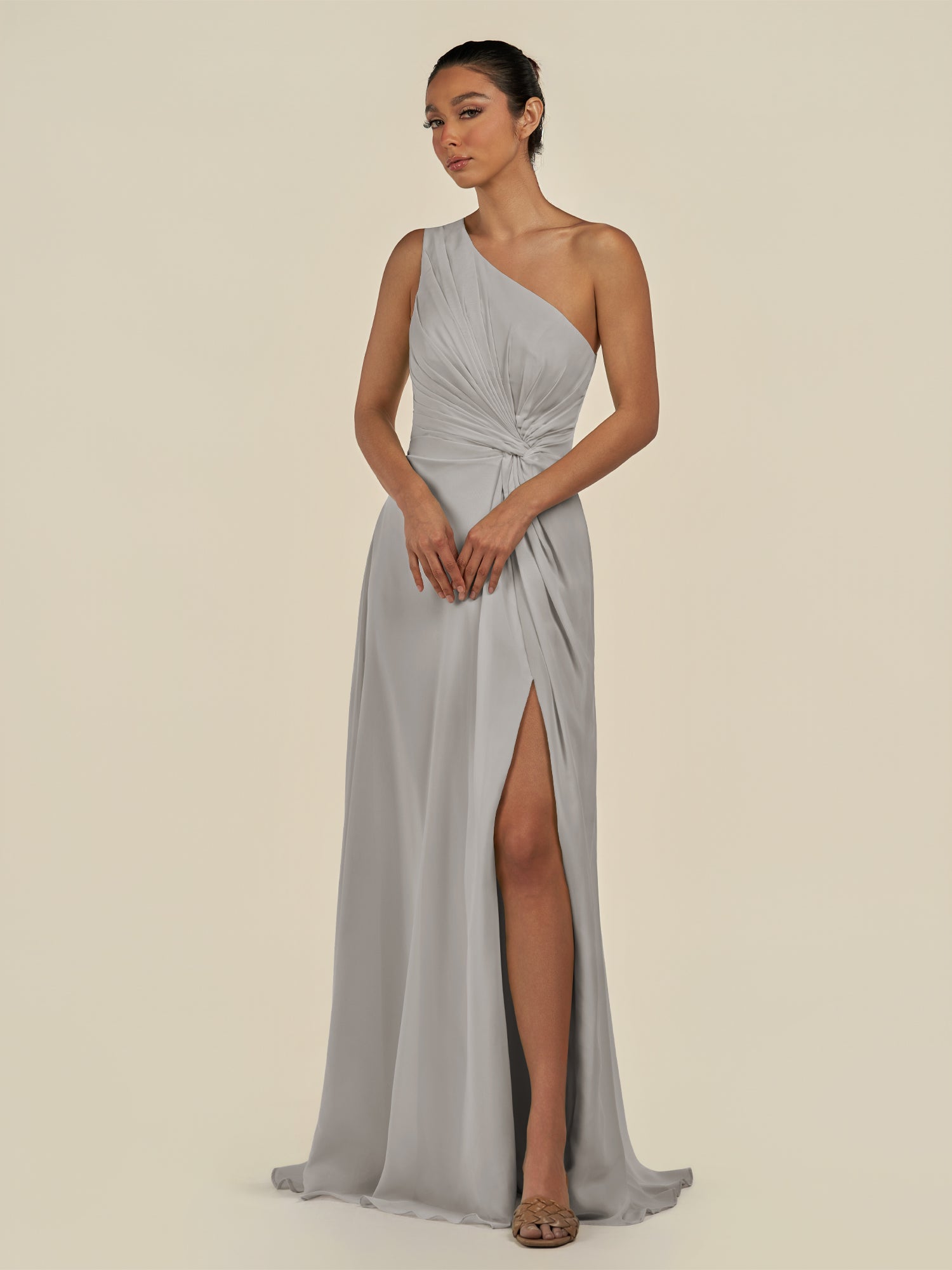 Gaela | Silver - A Line One Shoulder Chiffon Pleated Long Bridesmaid Dress with Slit