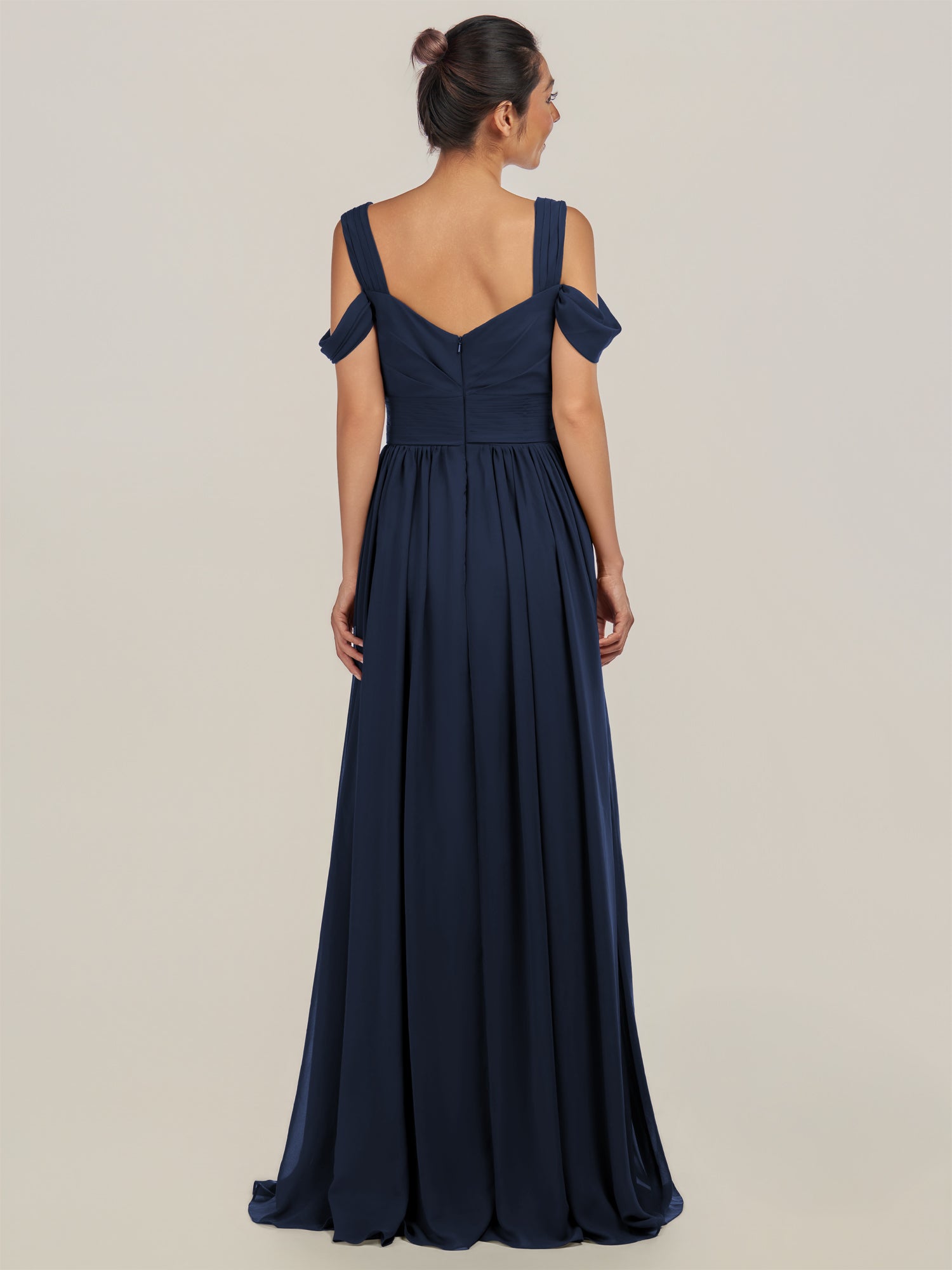 Helin embodies understated sophistication with her rich fig hue and graceful A-line silhouette. Crafted from weightless chiffon, she features an elegant off-the-shoulder neckline that flatters the collarbone and adds a romantic allure. The floor-length skirt drapes beautifully, opening into a soft slit that moves effortlessly with every step. Finished with a discreet zipper back, Helin is a vision of timeless beauty—perfect for a modern bridal party with a touch of classic charm