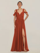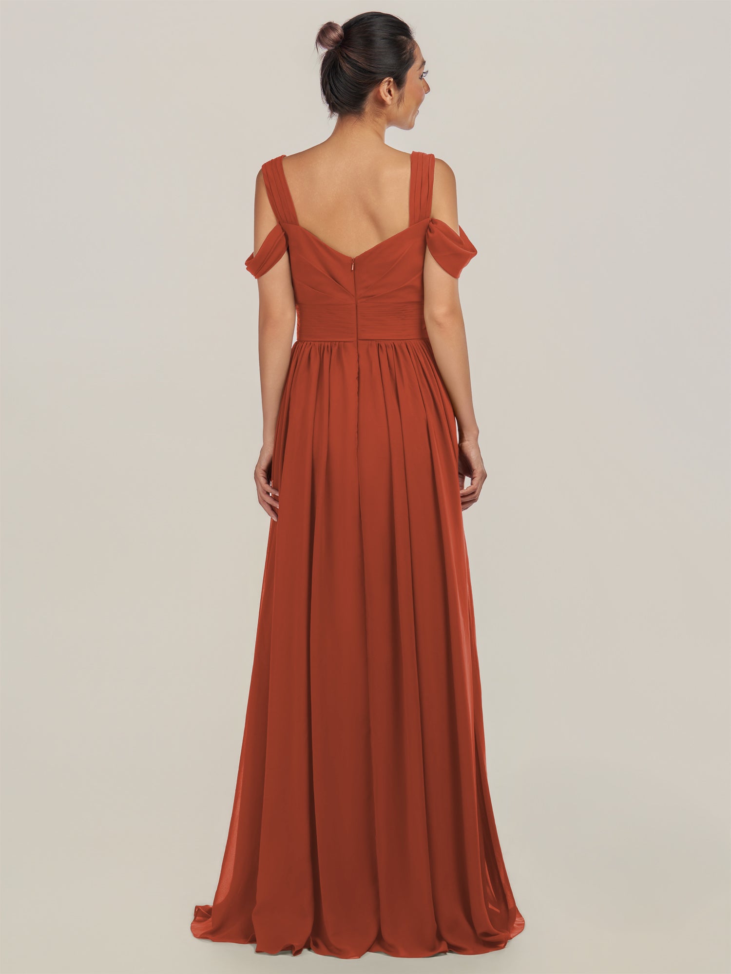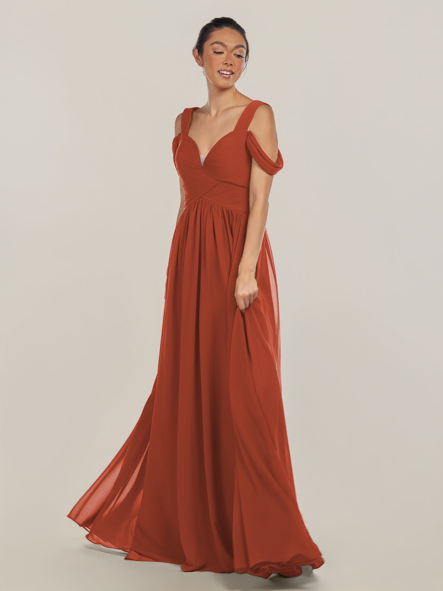 Helin embodies understated sophistication with her rich fig hue and graceful A-line silhouette. Crafted from weightless chiffon, she features an elegant off-the-shoulder neckline that flatters the collarbone and adds a romantic allure. The floor-length skirt drapes beautifully, opening into a soft slit that moves effortlessly with every step. Finished with a discreet zipper back, Helin is a vision of timeless beauty—perfect for a modern bridal party with a touch of classic charm