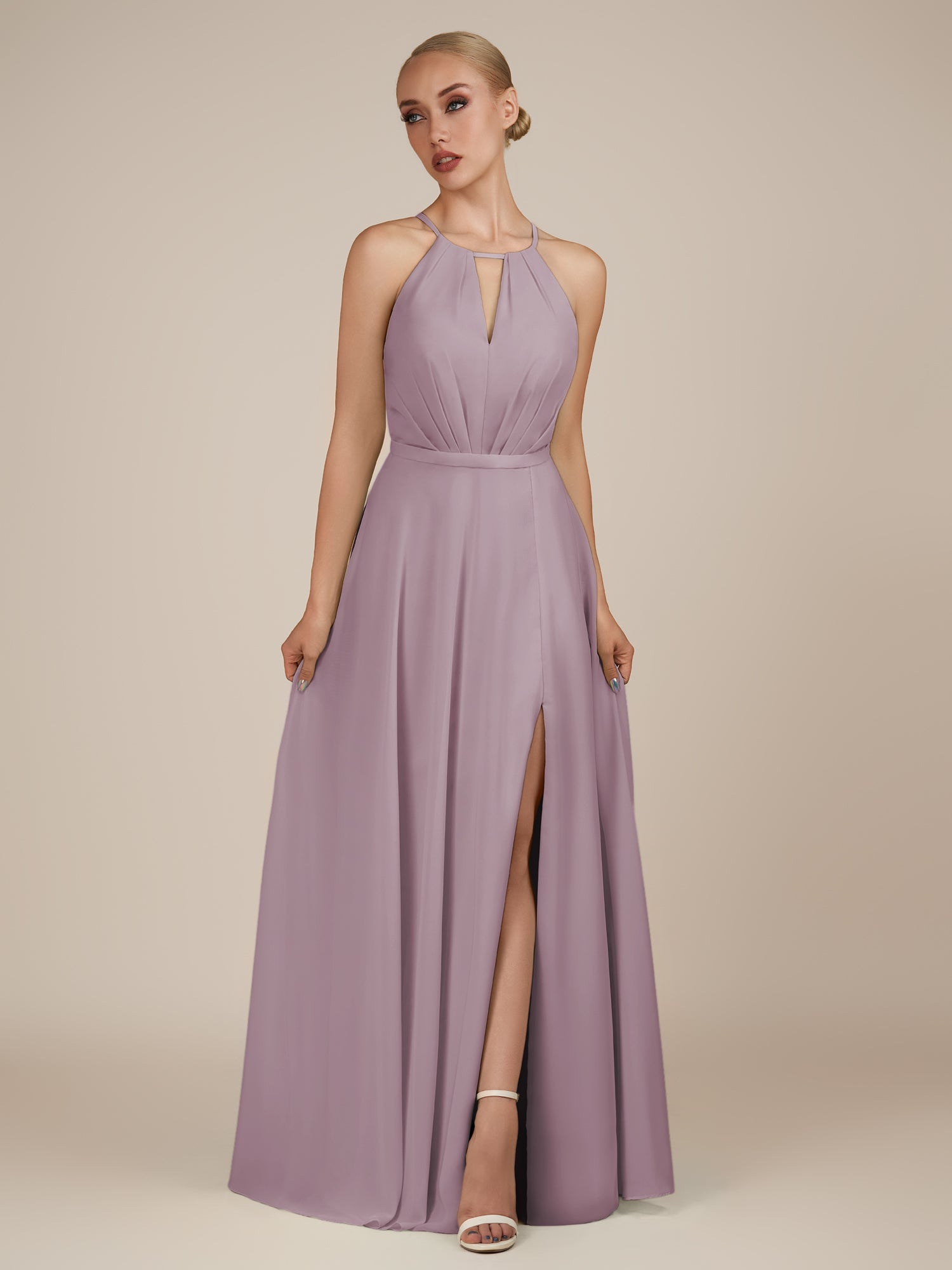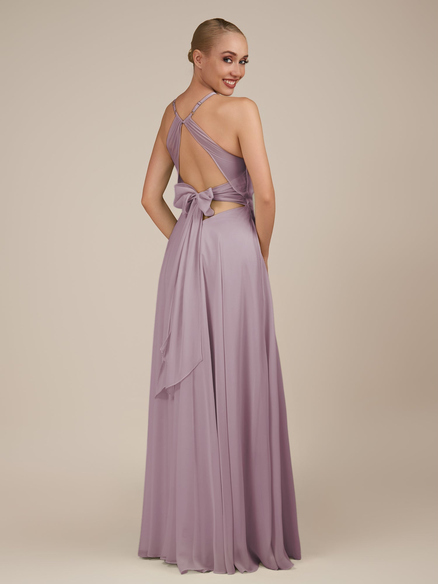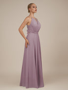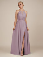 Illyria | Dusk - A Line Chiffon Halter Neck Long Bridesmaid Dress with Cut Out
