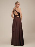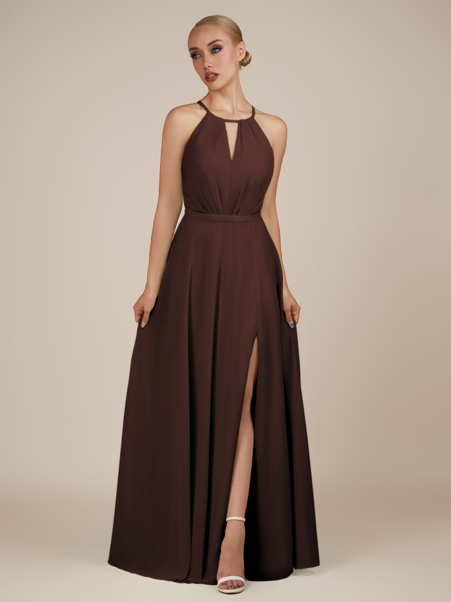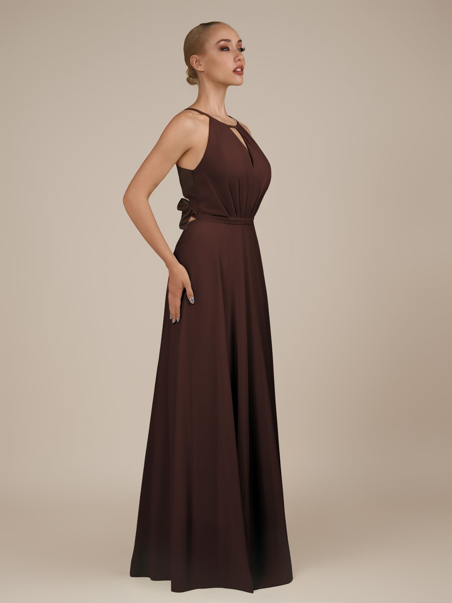 Illyria | Espresso - A Line Chiffon Halter Neck Long Bridesmaid Dress with Cut Out