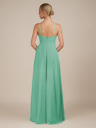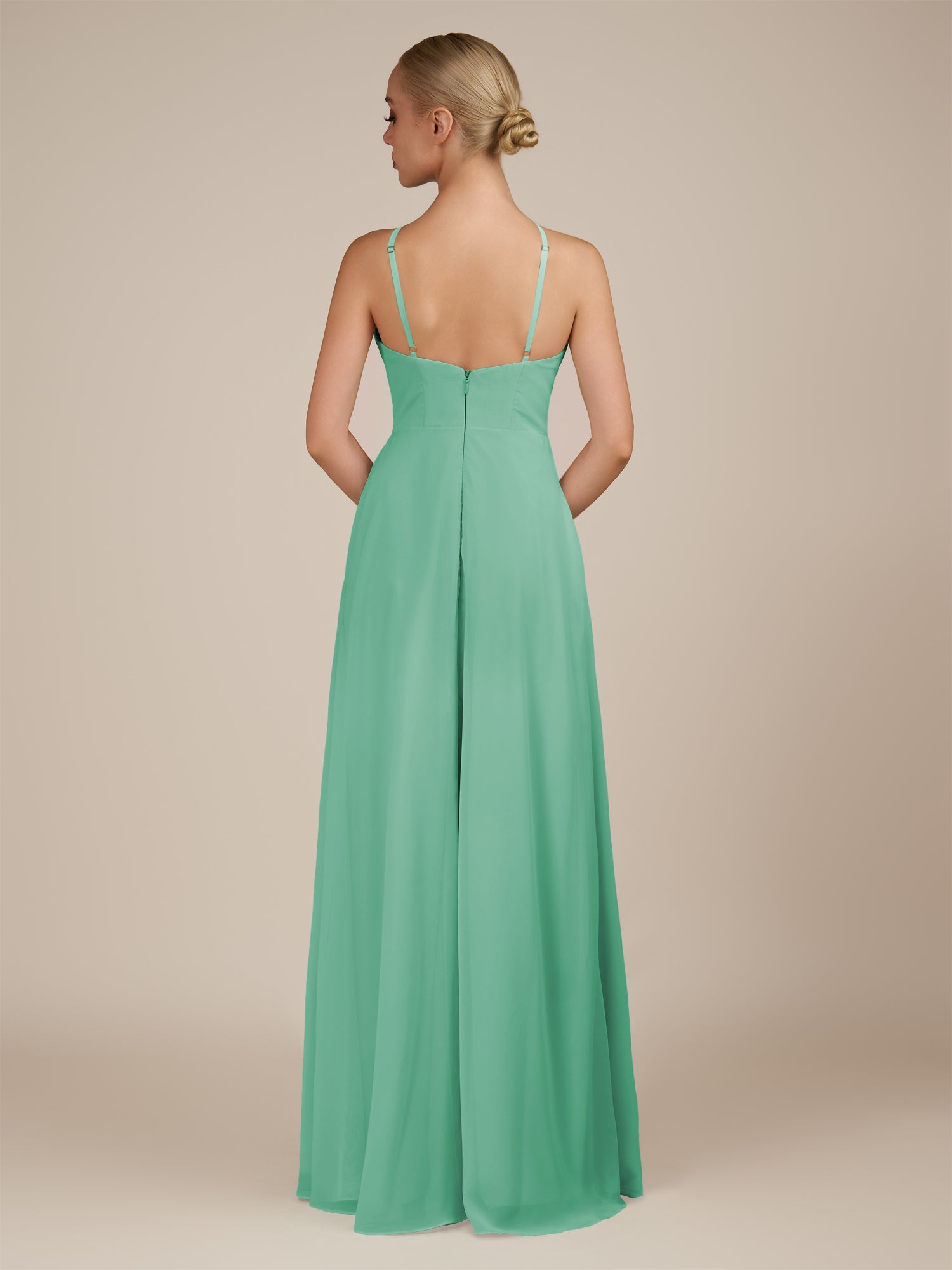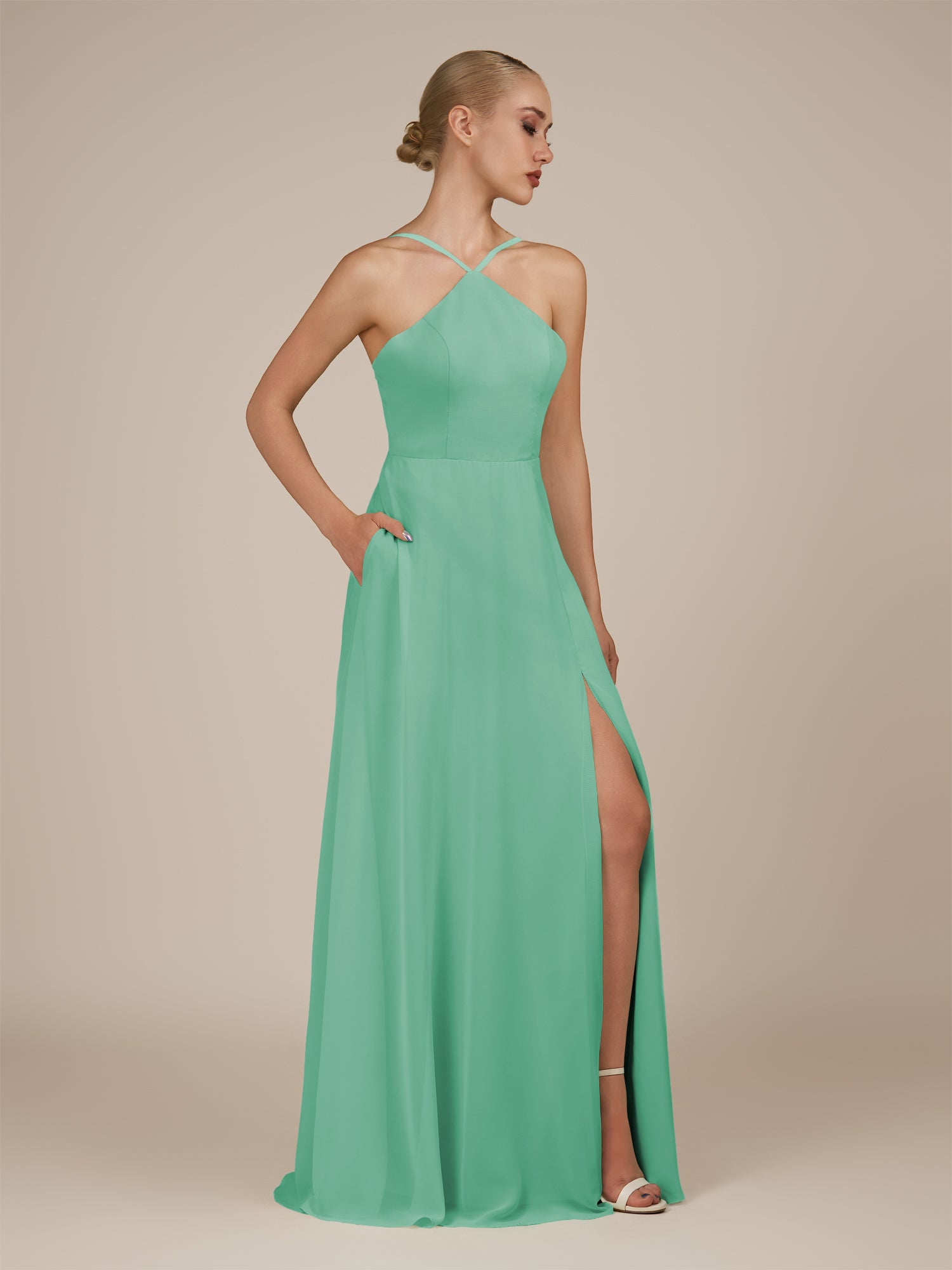Ione | Turquoise - A Line Chiffon Halter Neck Long Bridesmaid Dress with Slit
