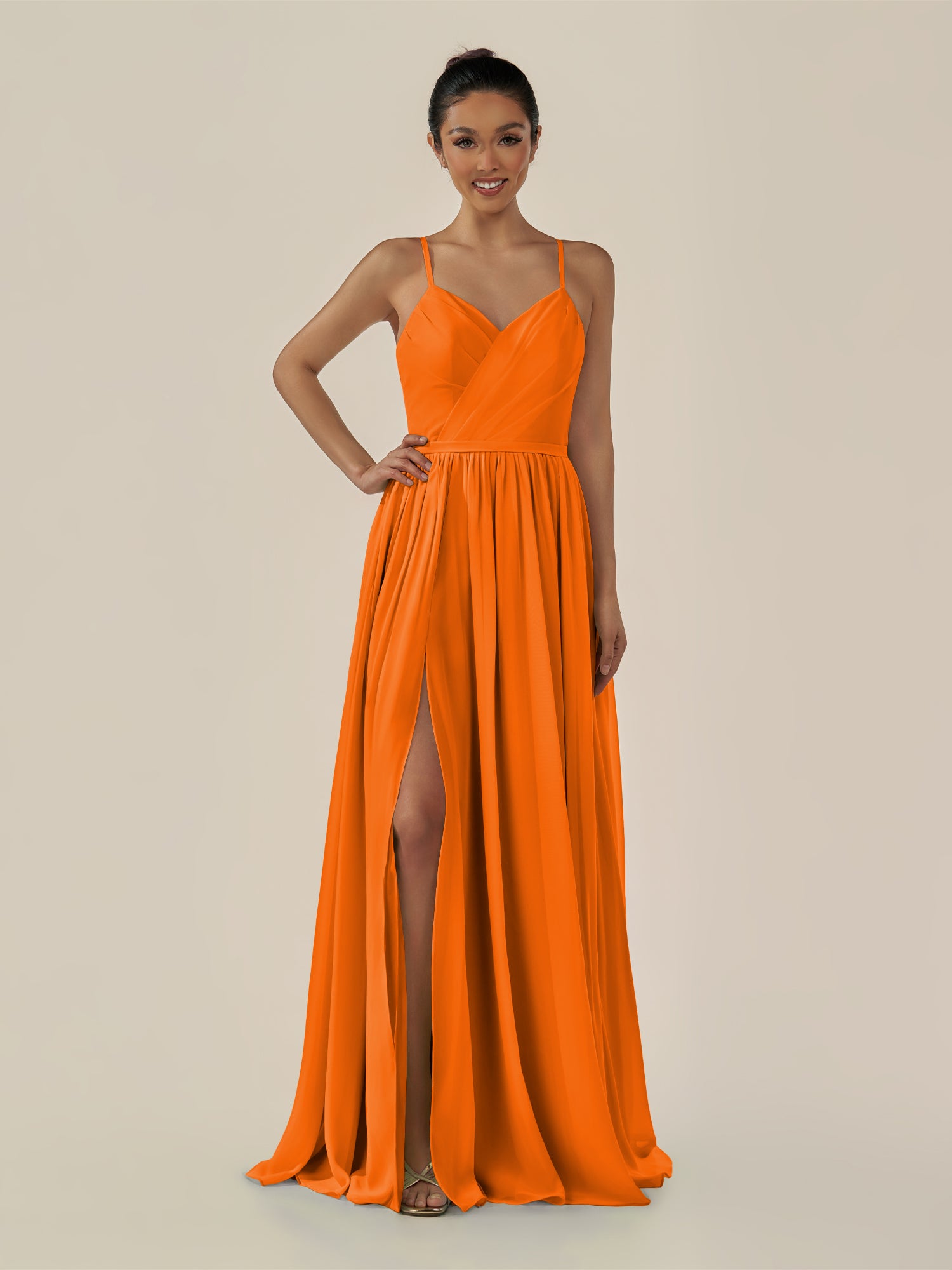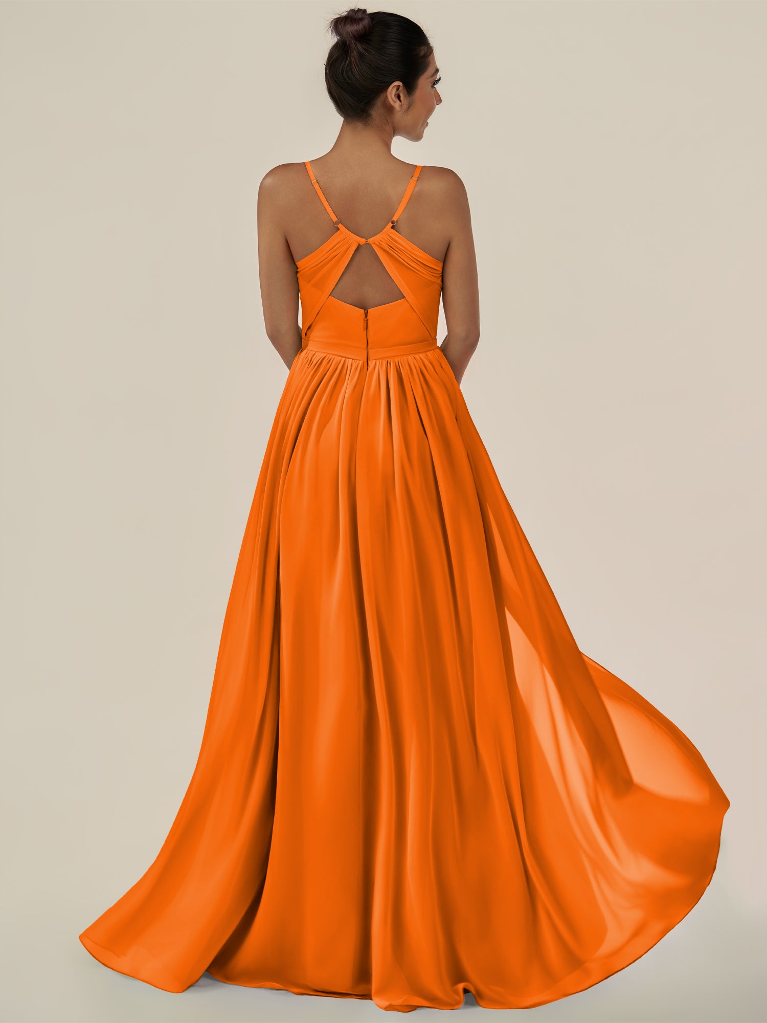 Irissa | Cinnamon - A Line Chiffon V Neck Pleated Long Bridesmaid Dress with Slit