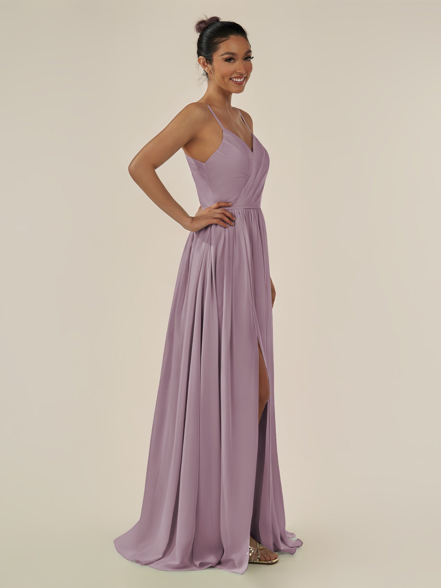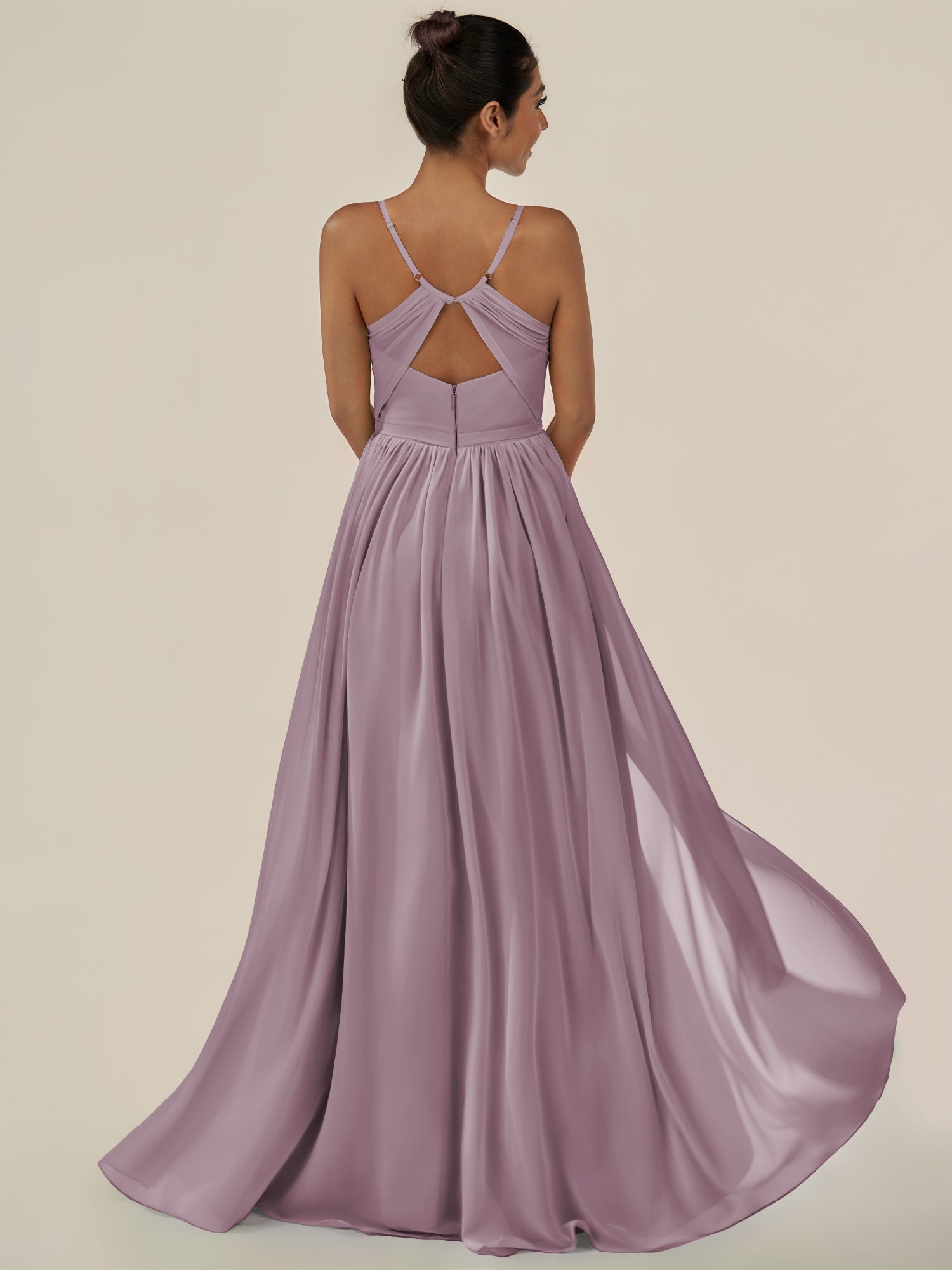 Irissa embodies graceful sophistication and modern charm. Crafted from soft chiffon, she features a flattering V-neckline and a sleeveless bodice that highlights the shoulders elegantly. Her floor-length A-line skirt flows effortlessly, enhanced by subtle pleats and a tasteful side slit for ease of movement. Finished with a smooth zipper back, Irissa is perfect for bridesmaids seeking a timeless and airy silhouette.