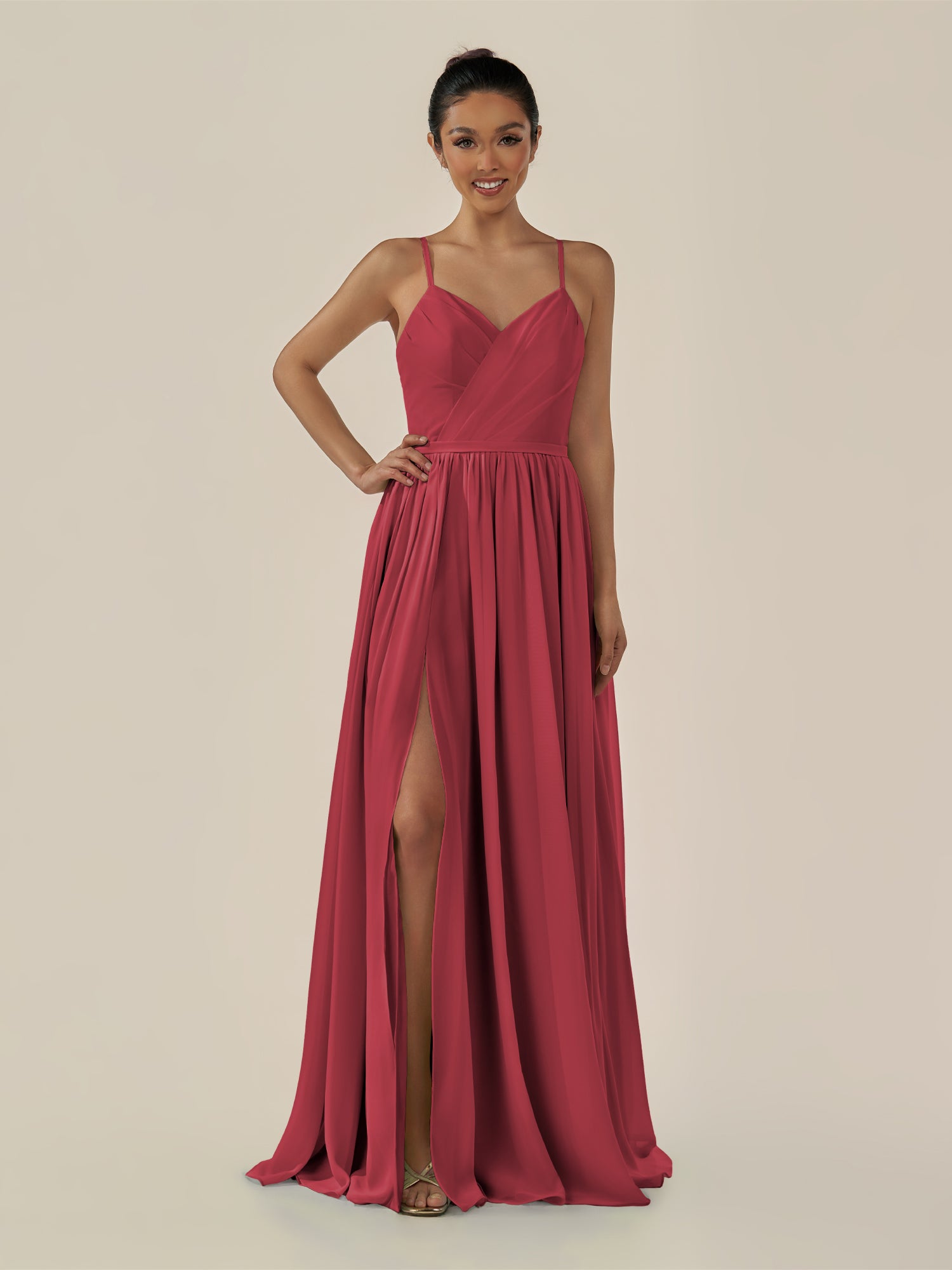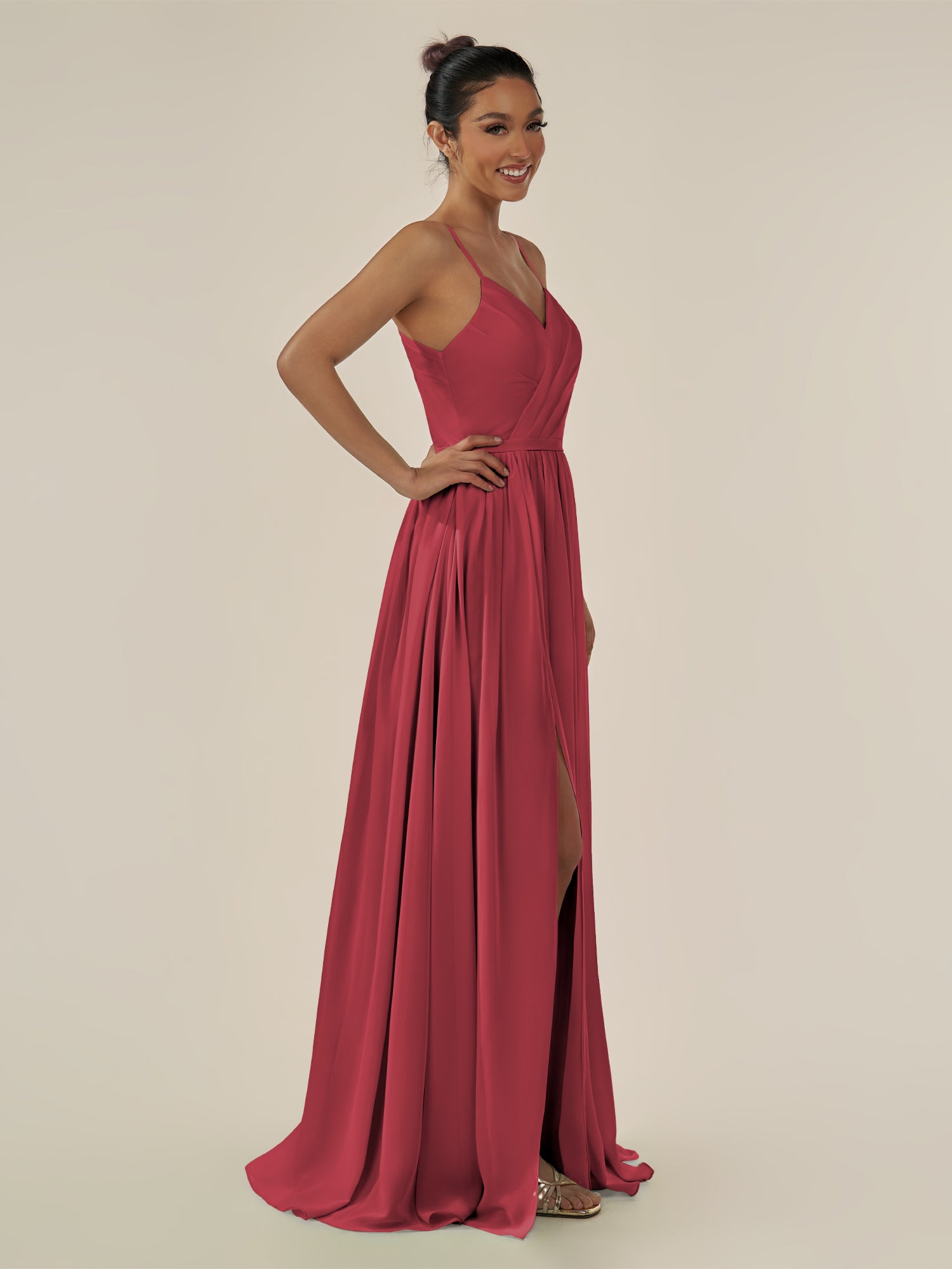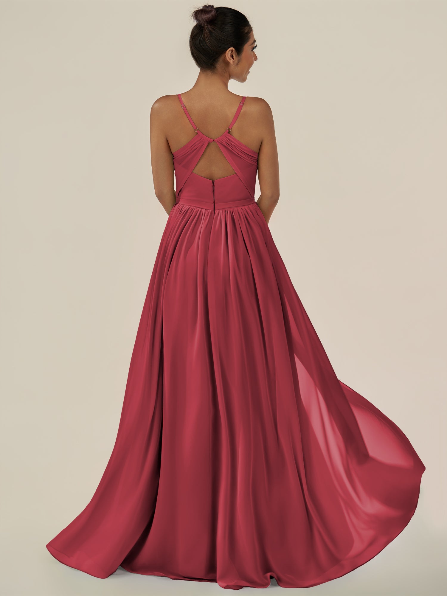 Irissa embodies graceful sophistication and modern charm. Crafted from soft chiffon, she features a flattering V-neckline and a sleeveless bodice that highlights the shoulders elegantly. Her floor-length A-line skirt flows effortlessly, enhanced by subtle pleats and a tasteful side slit for ease of movement. Finished with a smooth zipper back, Irissa is perfect for bridesmaids seeking a timeless and airy silhouette.